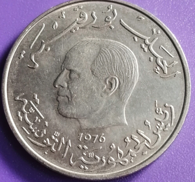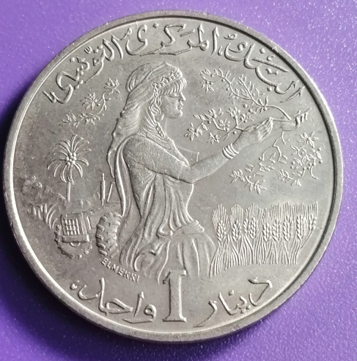Pièce de 1 dinar tunisienne de 1976. Etat : SUP. Frappée à 12.000.000 d’exemplaires.
