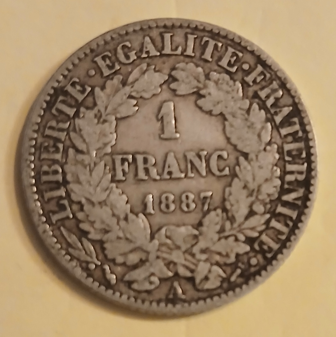 1 franc argent (5g, 83,5%) type Cérès de 1887 A. Frappée à 3.291.930 exemplaires. G. : 465a. Etat : TB.