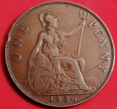 Pièce de 1 penny anglaise de 1936 type Georges V. Etat : TTB. Frappée à 154.296.000 exemplaires.