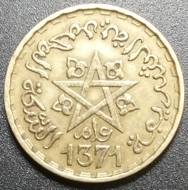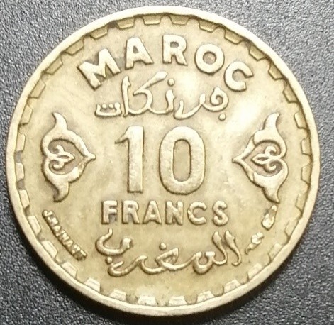 Pièce de 10 francs marocaine de 1371 (1952). Etat : SUP. Frappée à 40,000,000 d’exemplaires.