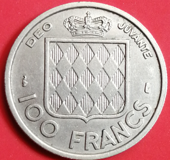 Pièce de 100 francs Monaco de 1956. Etat : TTB. Frappée à 500,000 exemplaires seulement.