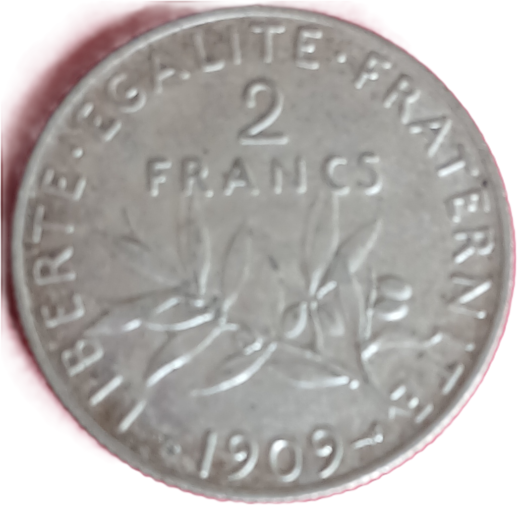 2 francs type Semeuse en argent (10g, 83,5%) de 1909. G. : 532. Frappée à 1.000.265 exemplaires seulement. Etat : TB+.