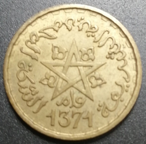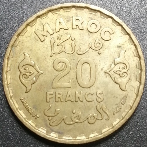 Pièce de 20 francs marocaine de 1371 (1952). Etat : SUP. Frappée à 20,000,000 d’exemplaires.
