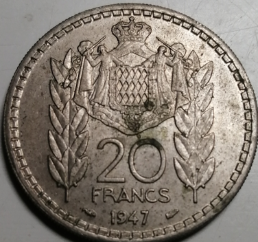 Pièce de 20 francs Monaco de 1947. Etat : TTB. Frappée à 1,000,000 exemplaires seulement.