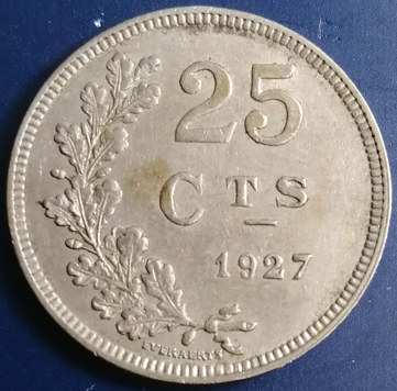 Pièce de 25 centimes luxembourgeoise de 1927. Etat : TTB. Frappée à 2.500.000 exemplaires.