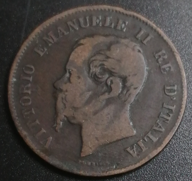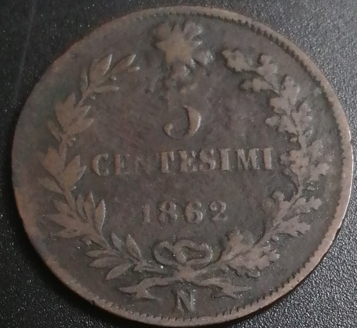 Pièce de 5 centesimi italienne 1862 N (atelier de Naples). Etat : TB. Frappée à 106.293.000 exemplaires.