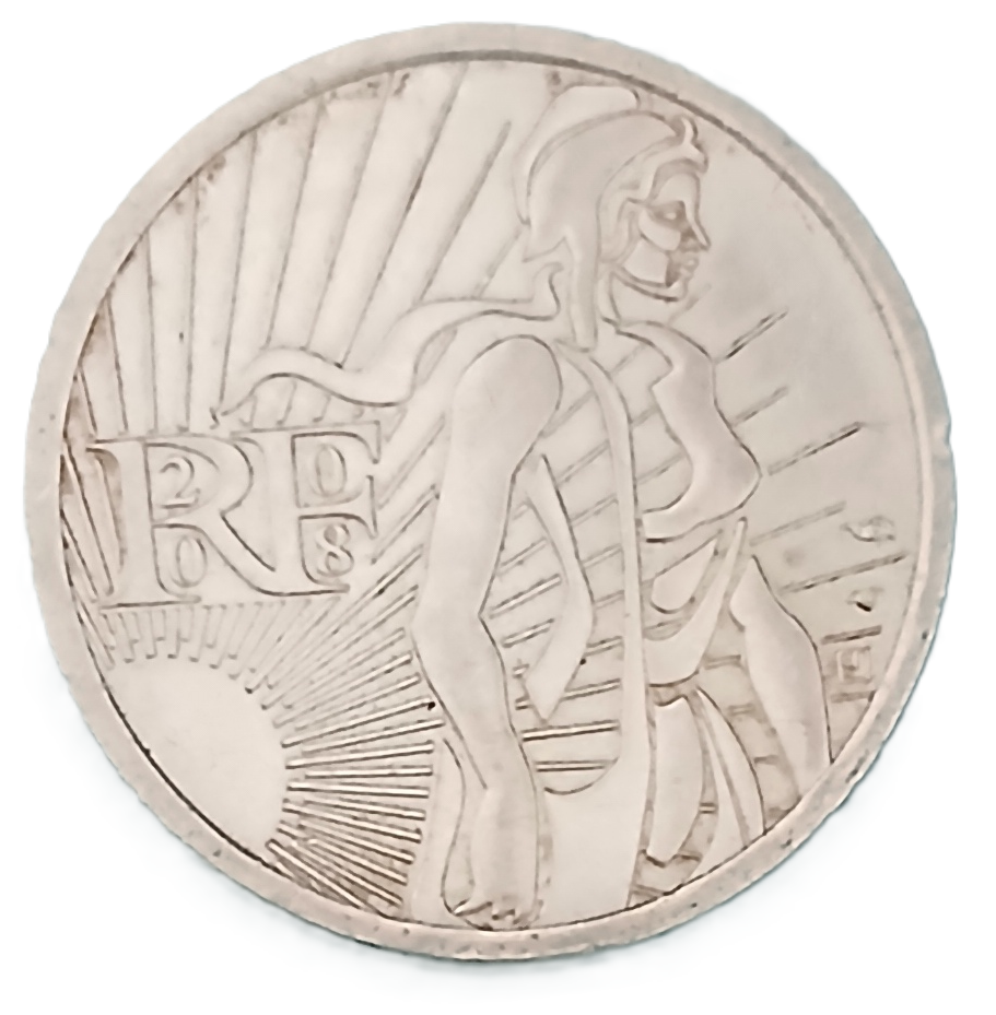 Pièce de 5 euros en argent (10g, 50%) française de 2008 type Semeuse. Frappée à 2.000.000 d’exemplaires. Etat : FDC.