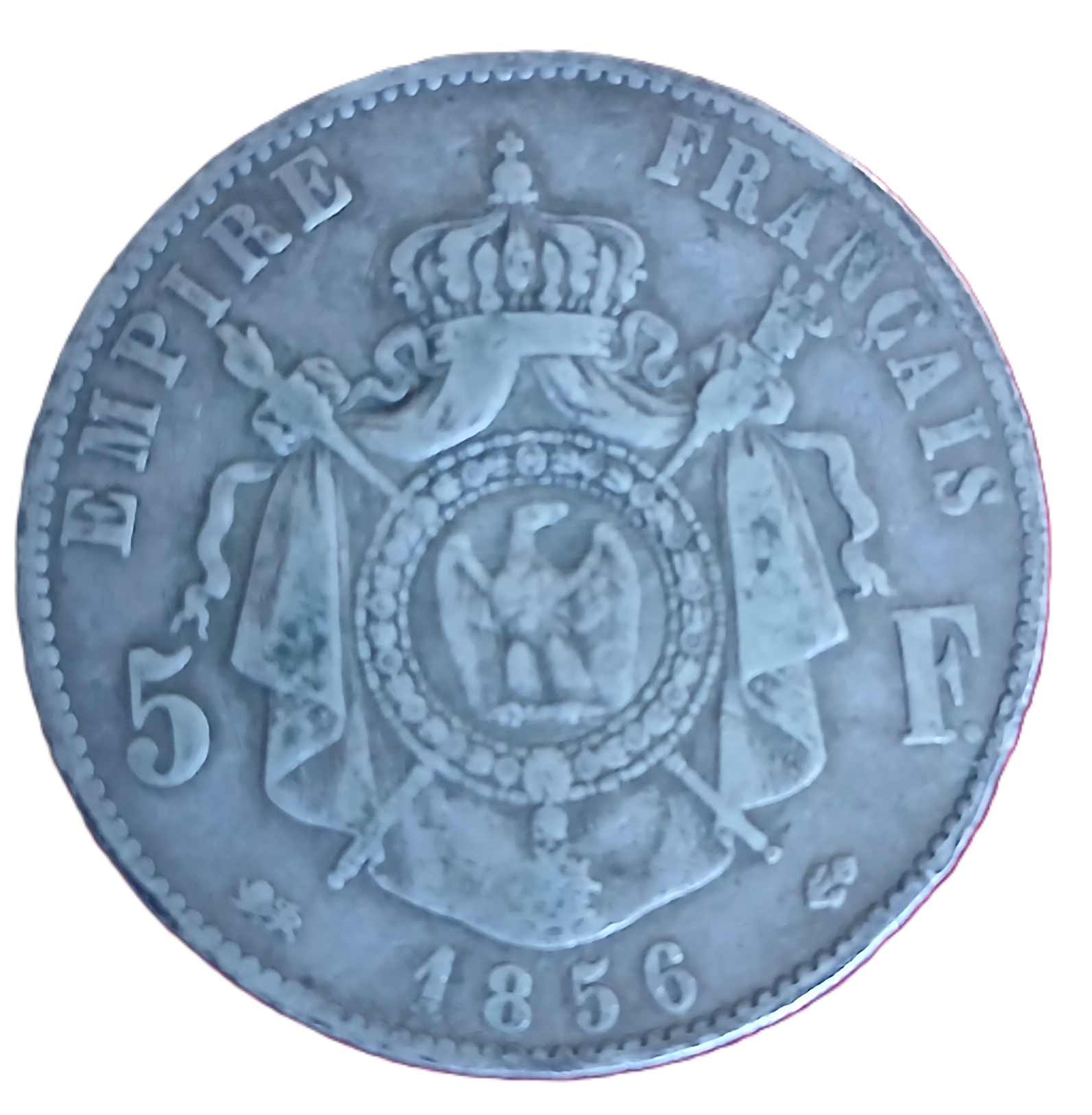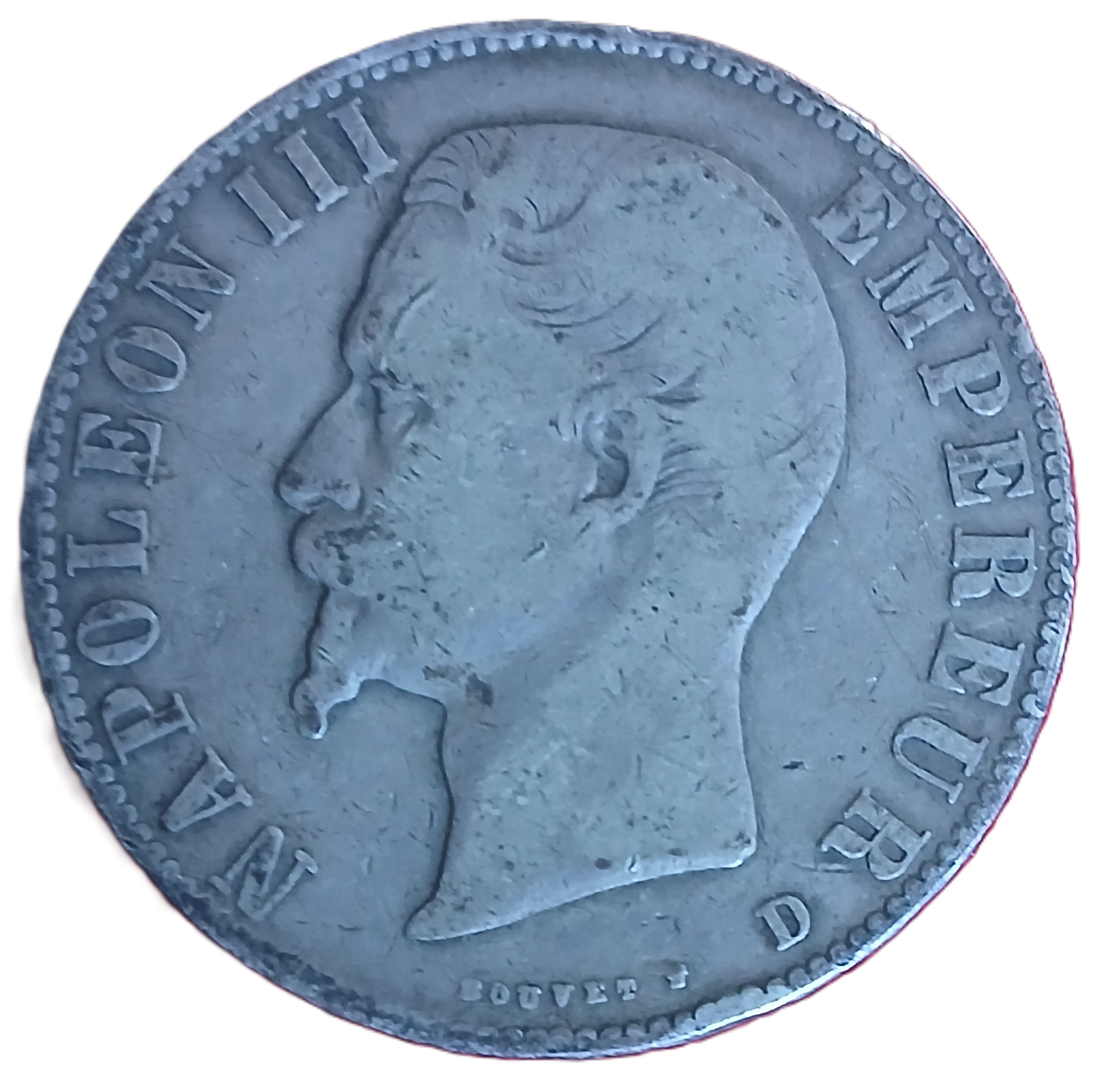 5 francs argent (module écu, 25g, 90%) type Napoléon III tête nue. Année 1853 D (atelier de Lyon). G. : 734. Frappée à 1.758.235 exemplaires. Etat : TB.