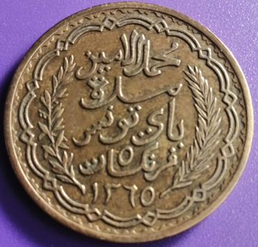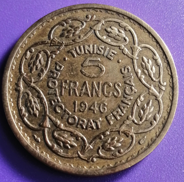 Pièce de 5 francs tunisienne de 1946. Etat : TTB. Frappée à 10.000.000 d’exemplaires.
