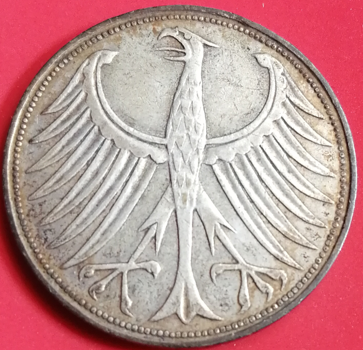 Pièce de 5 Marks allemande de 1951 D (atelier de Münich). Frappée à 20.600.000 exemplaires. Etat : TB. Argent : 11,2g, 62,5%.