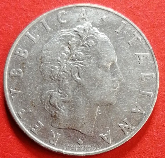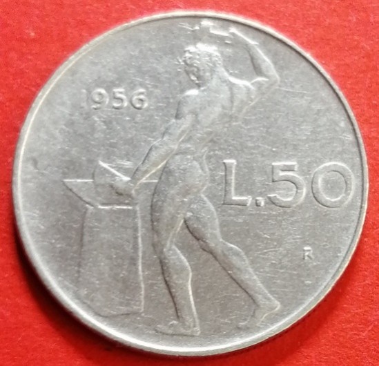 Pièce de 50 lires italienne de 1956. Etat : TTB. Frappée à 69,400,000 exemplaires.