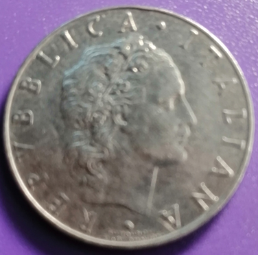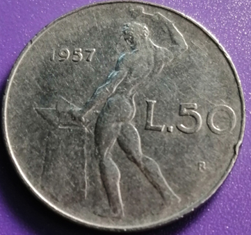 Pièce de 50 lires italienne de 1957. Etat : TB. Frappée à 8.925.000 exemplaires.