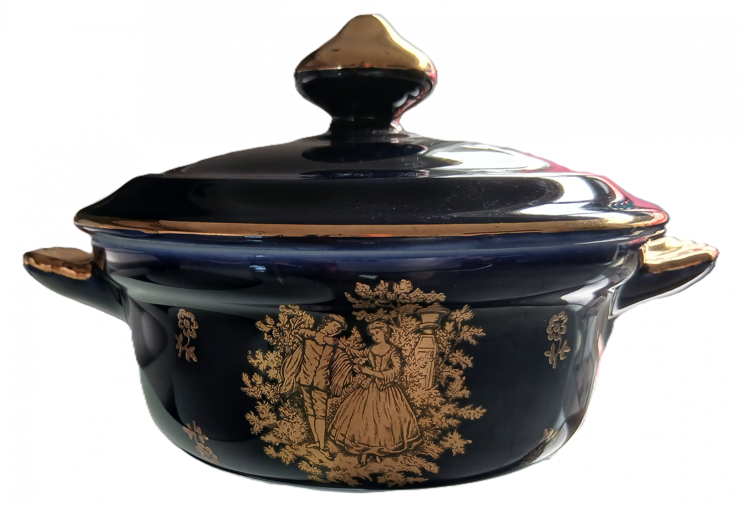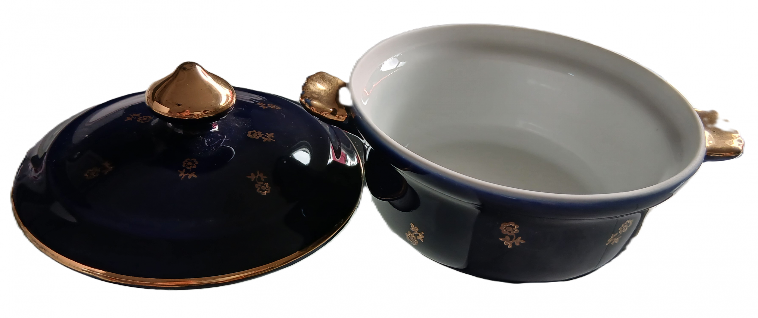 Jolie bonbonnière en porcelaine de Limoges. Couleur traditionnelle de la période classique bleue cobalt et dorures.