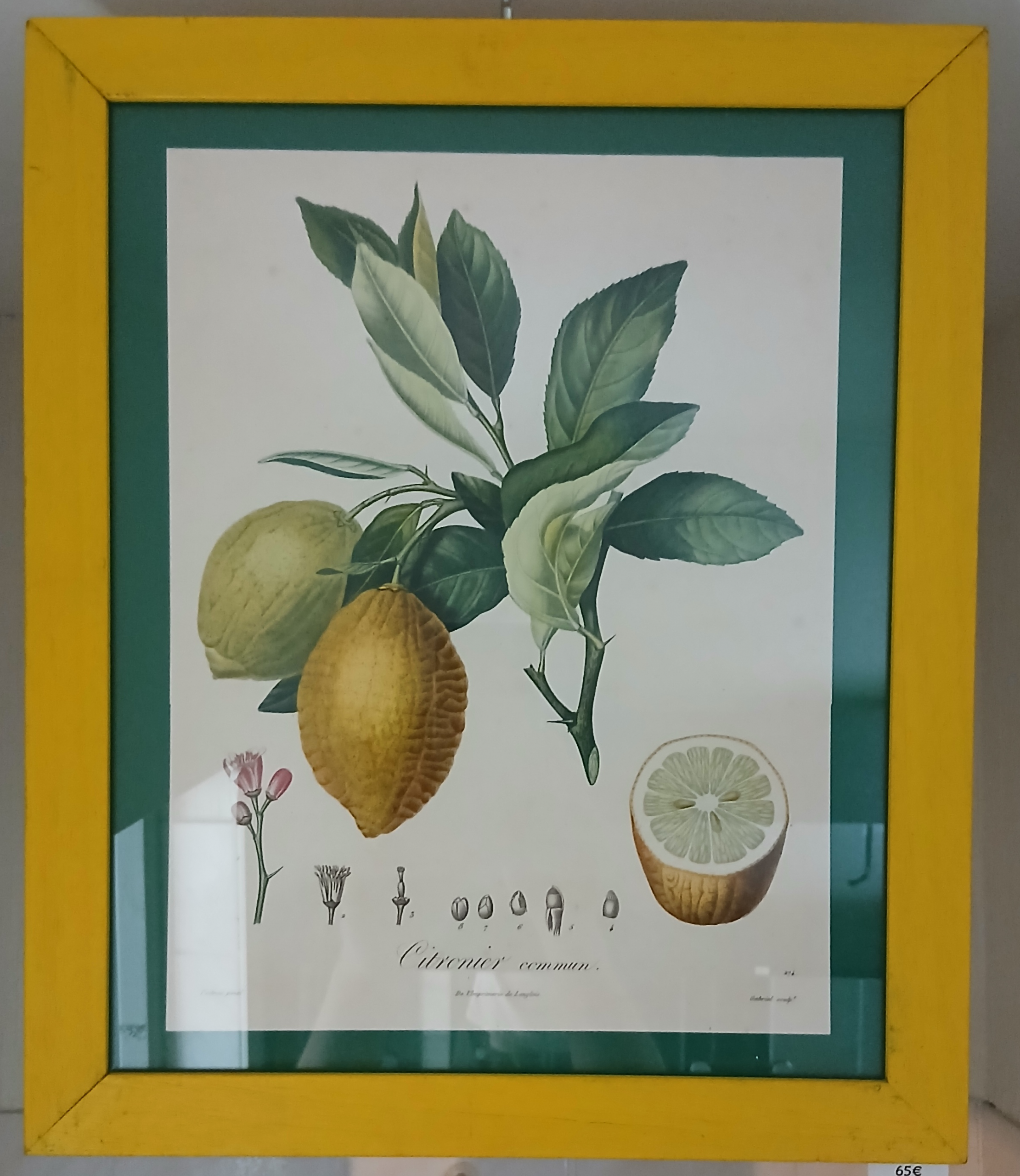 Cadre jaune et vert présentant une page d’une édition botanique du 19ème siècle des éditions Langlois : Citronier commun, p. 276. Présentation typique et couleurs exceptionnelles pour une édition de l’époque signe qu’elle est issue d’une édition prestigieuse. dimensions : 34cmx40,5cm. A prendre sur place envoi trop risqué.