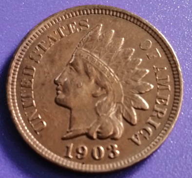Pièce de 1 cent américaine de 1903 type à l’indien. Etat : TTB. Frappée à 85.094.493 exemplaires.