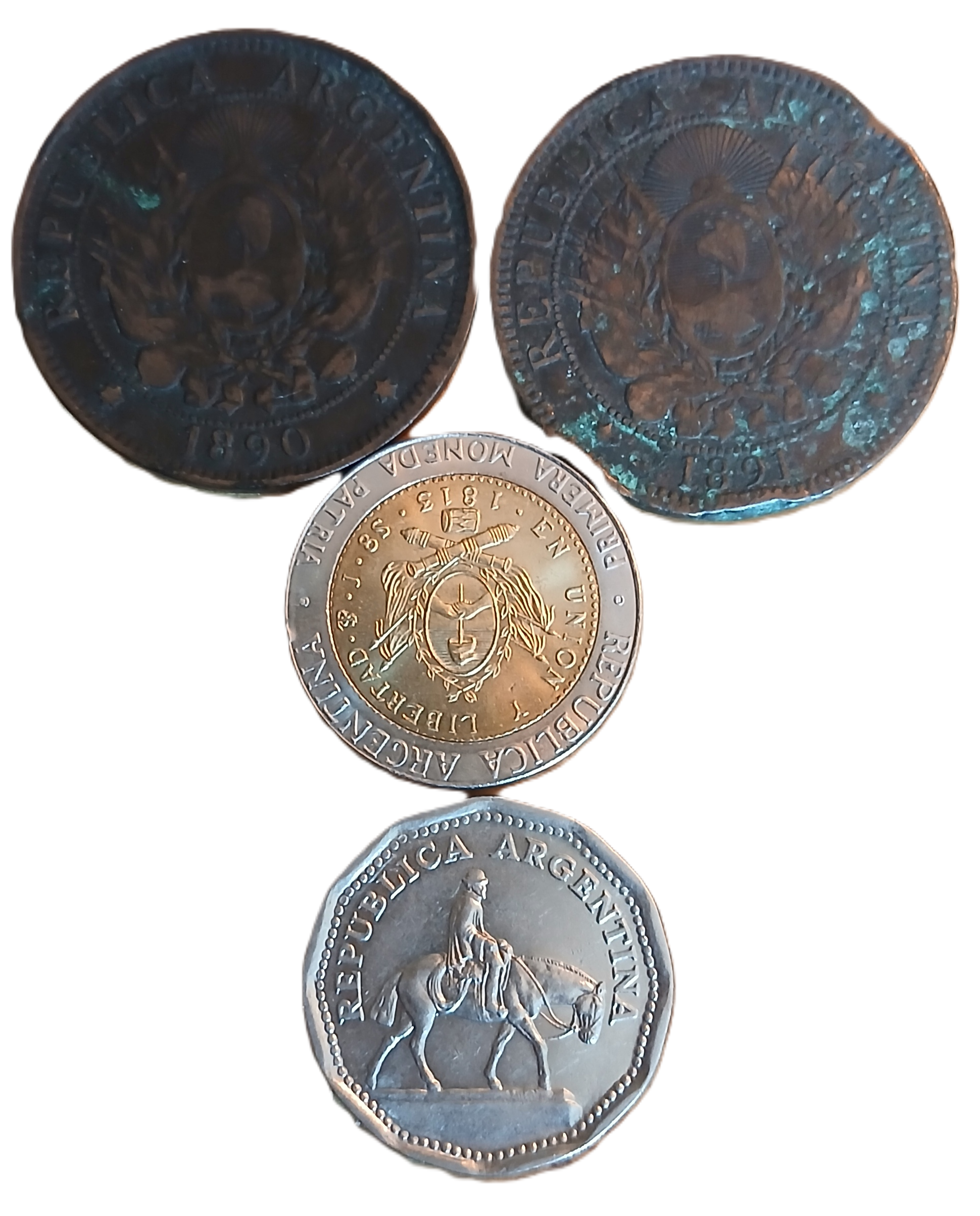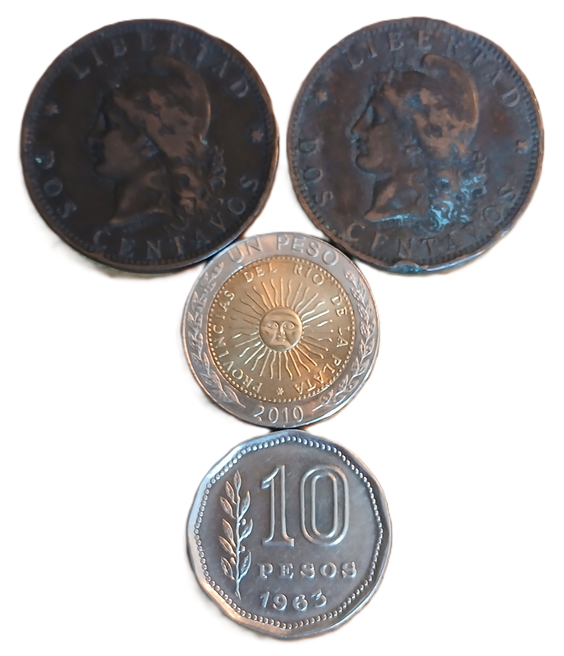 Lot de pièces de monnaie argentines composé des pièces suivantes : 10c 1890 et 1891, 1peso 2010 (FDC), 10 pesos 1963.