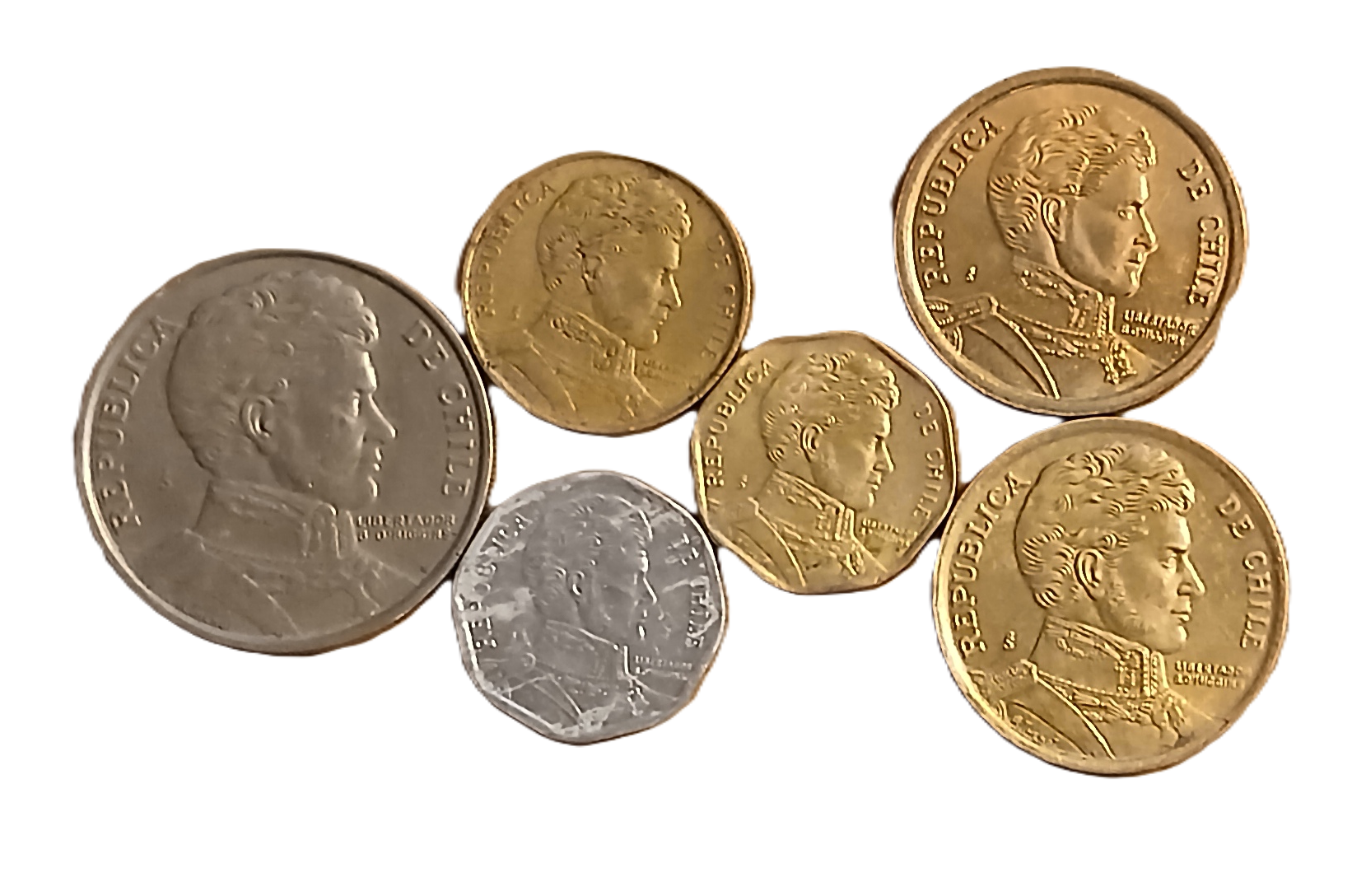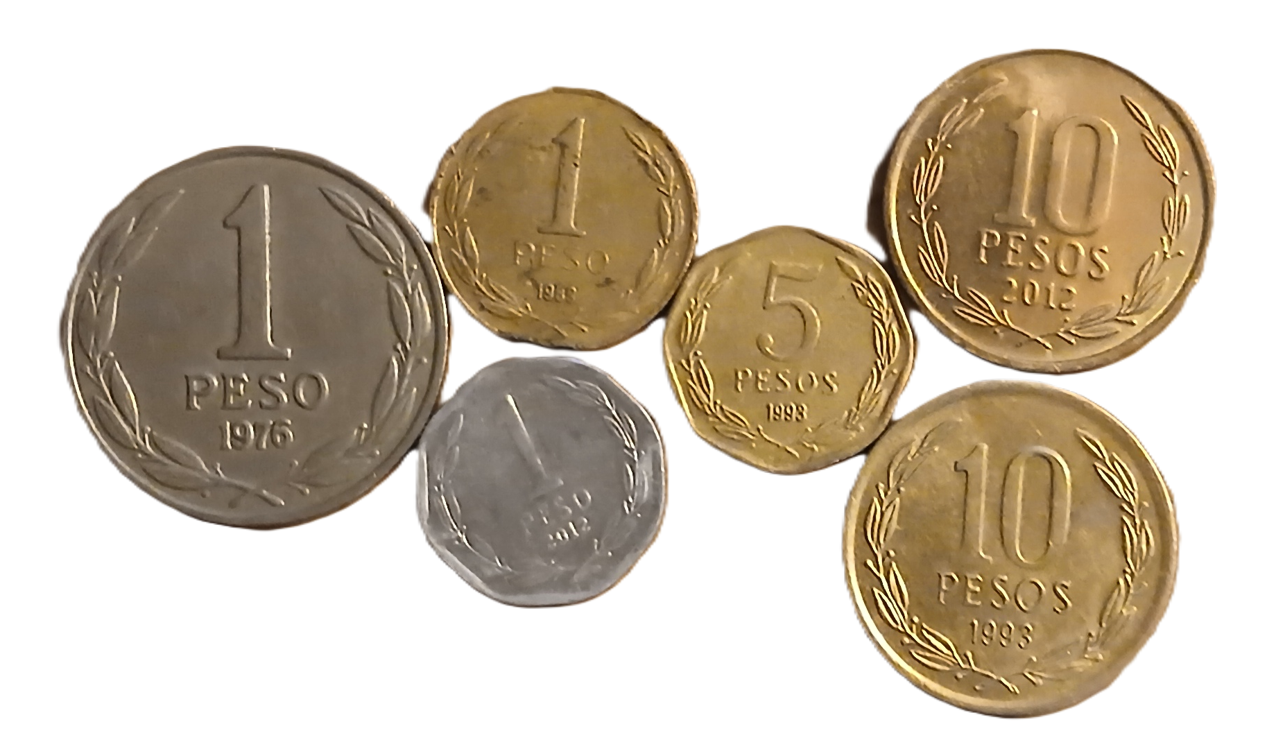 Lot de pièces de monnaie chiliennes composé de : 1P 1976, 1P 1989, 1P 2012, 5P 1993, 10P 1993 et 2012.