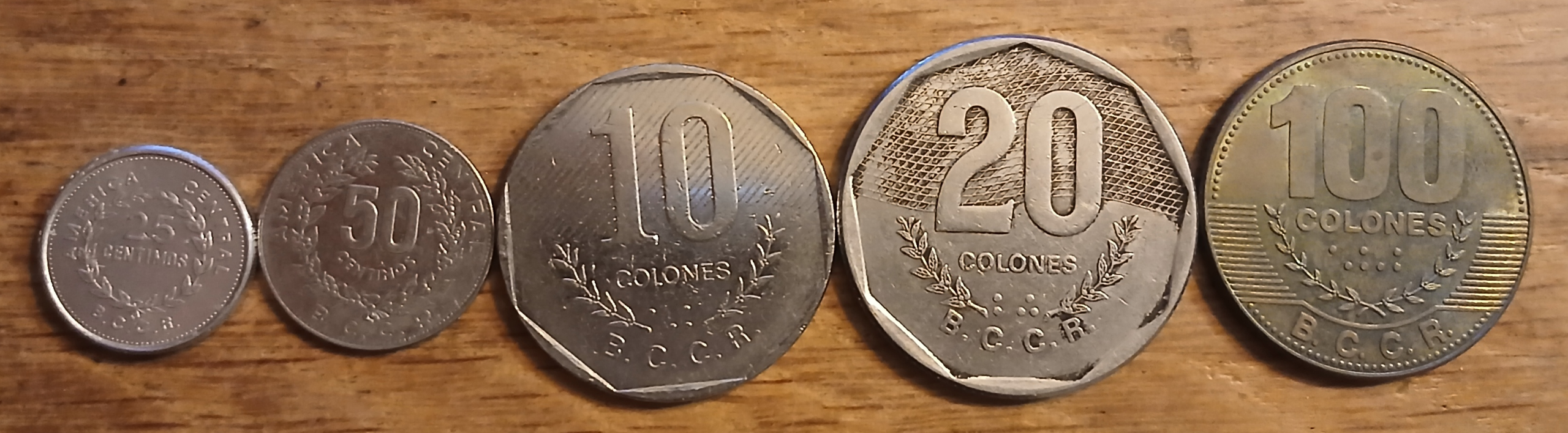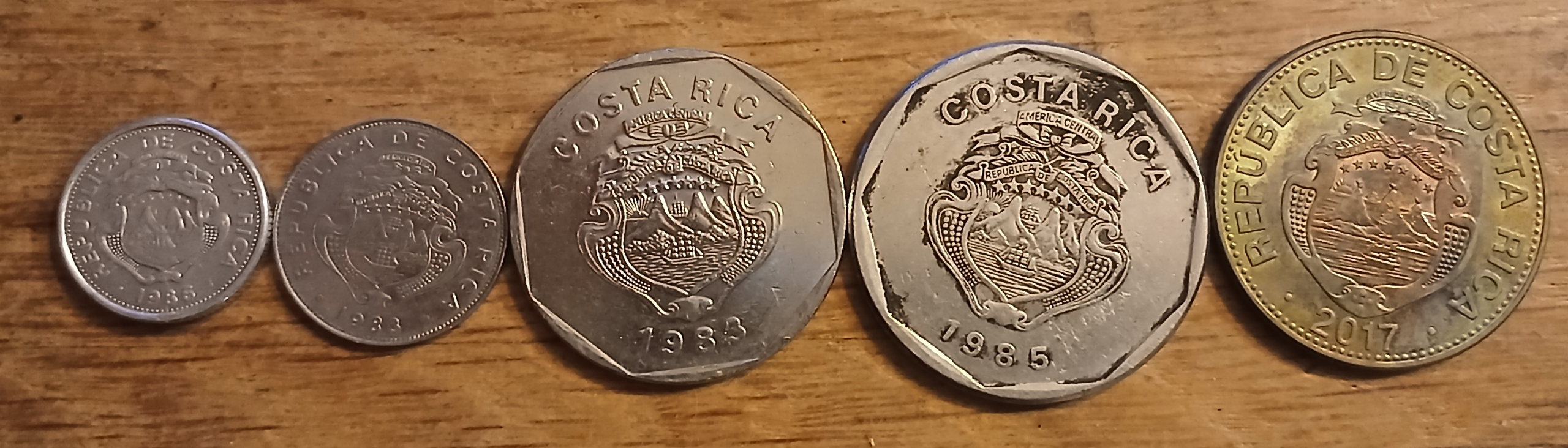 Lot de pièces de monnaie du Costa Rica composé de : 20c 1986, 50c 1983, 10 Colons 1983, 20 Colons 1985, 100 Colons 2017.