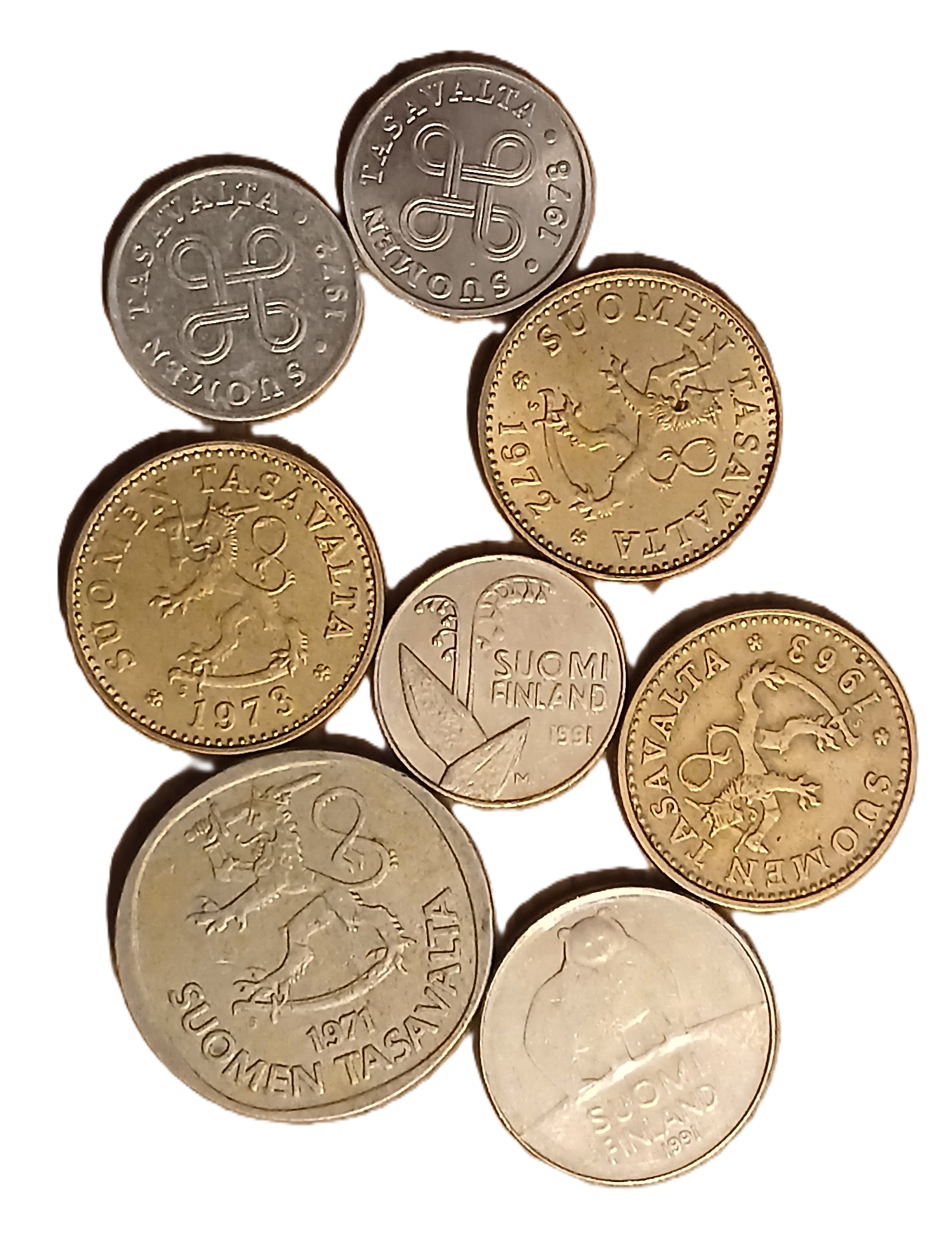 Lot de pièces de monnaie finlandaises composé de : 1 Penni 1972 et 1978, 10 Penni 1963, 1972 et 1973, 10 Penni 1991, 50 Penni 1991, 1 Mark 1971.