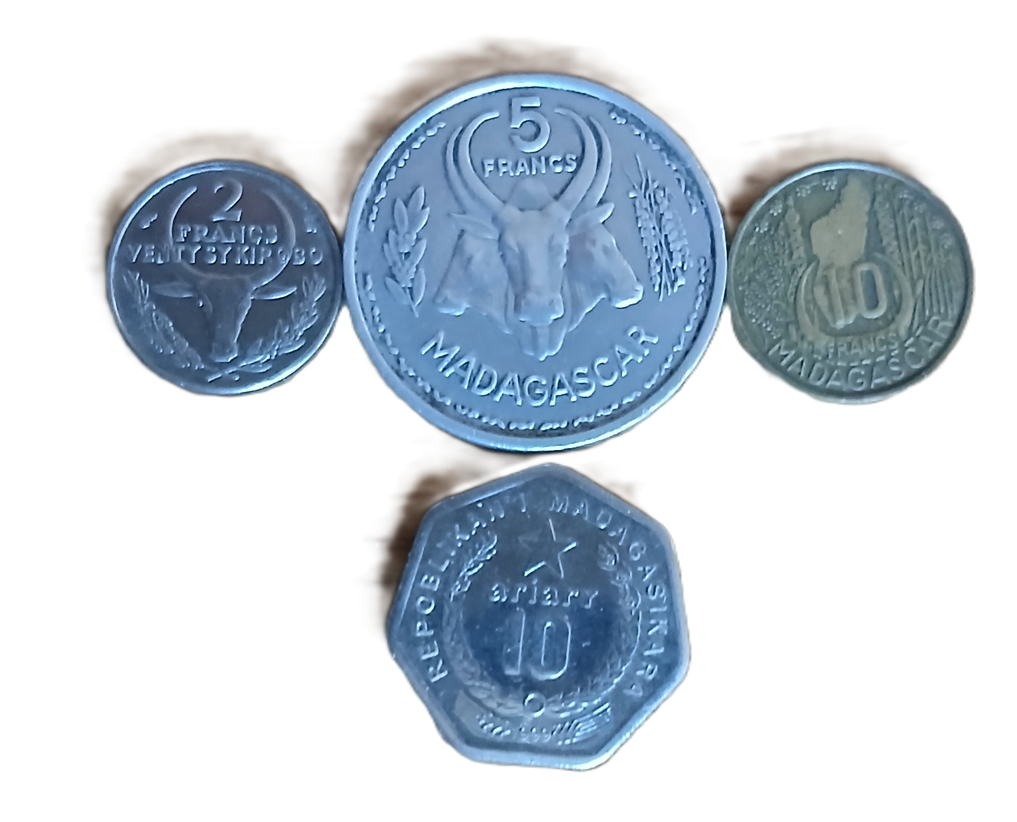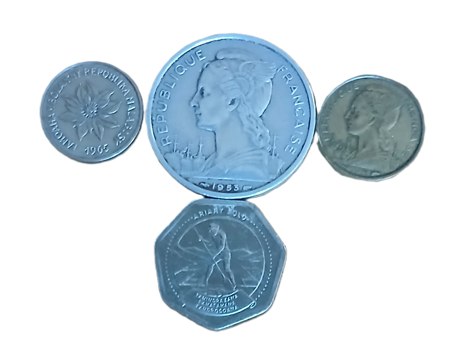 Lot de pièces de monnaie malgaches composé de : 2f 1965, 5F 1953, 10F 1953, 10A 1999.