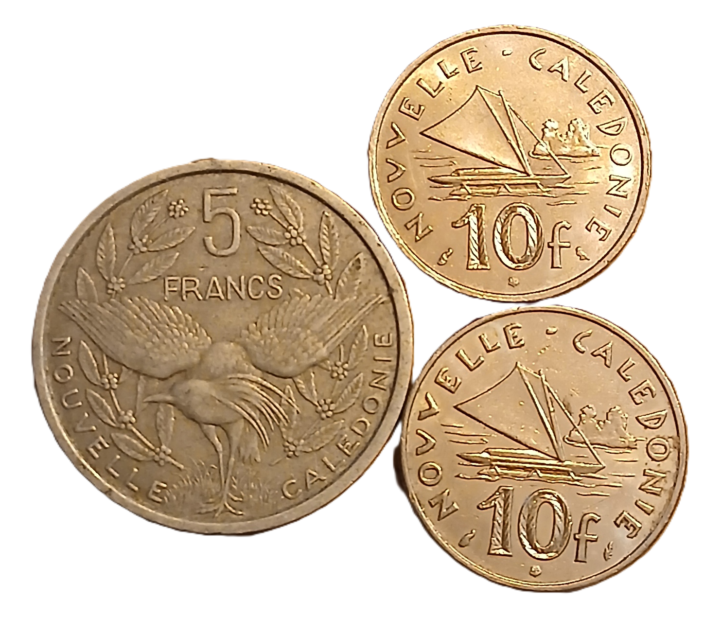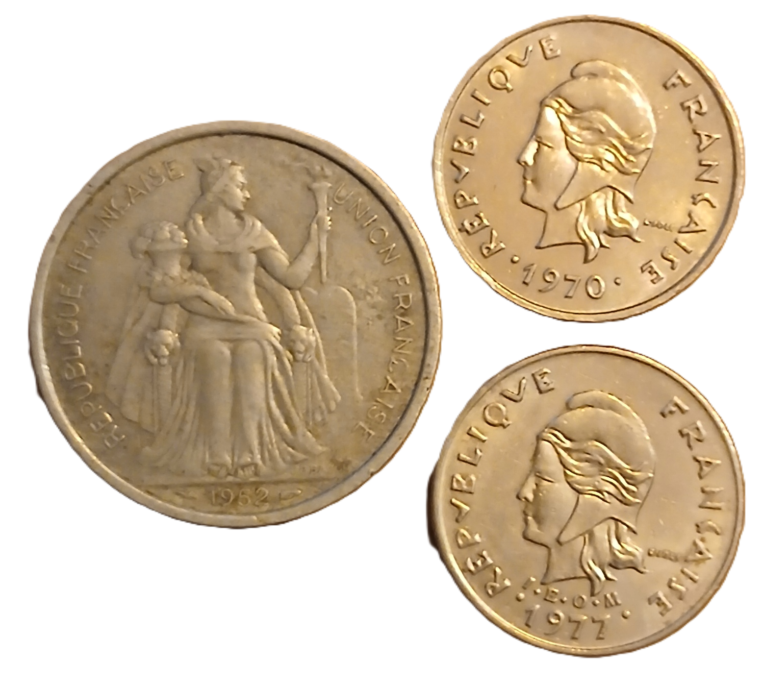 Lot de pièces de monnaie de Nouvelle-Calédonie composé de : 5F 1952, 10F 1970 et 1977.