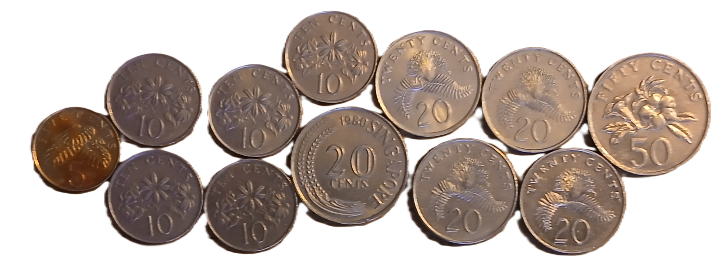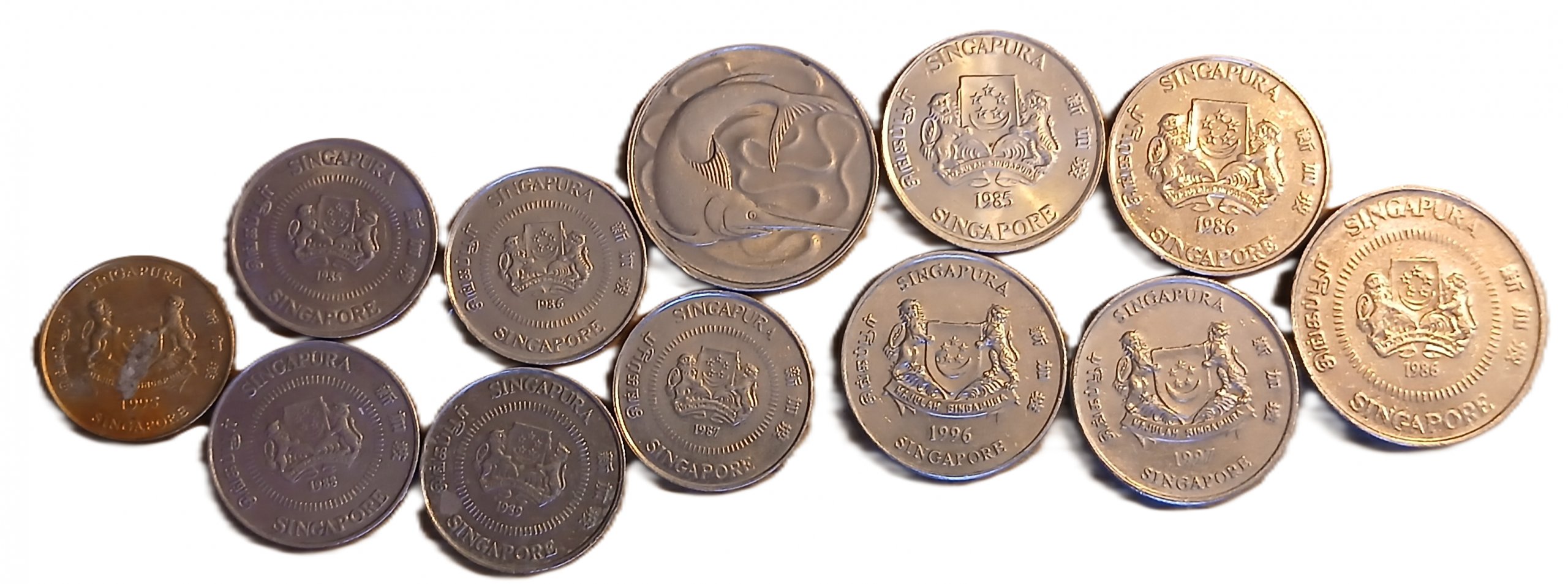 Lot de pièces de monnaie de Singapour composé de : 5c 1995, 10c 1985, 1986, 1987, 1988, 1989, 20c 1980, 20c 1985, 1986, 1996, 1997, 50c 1986.