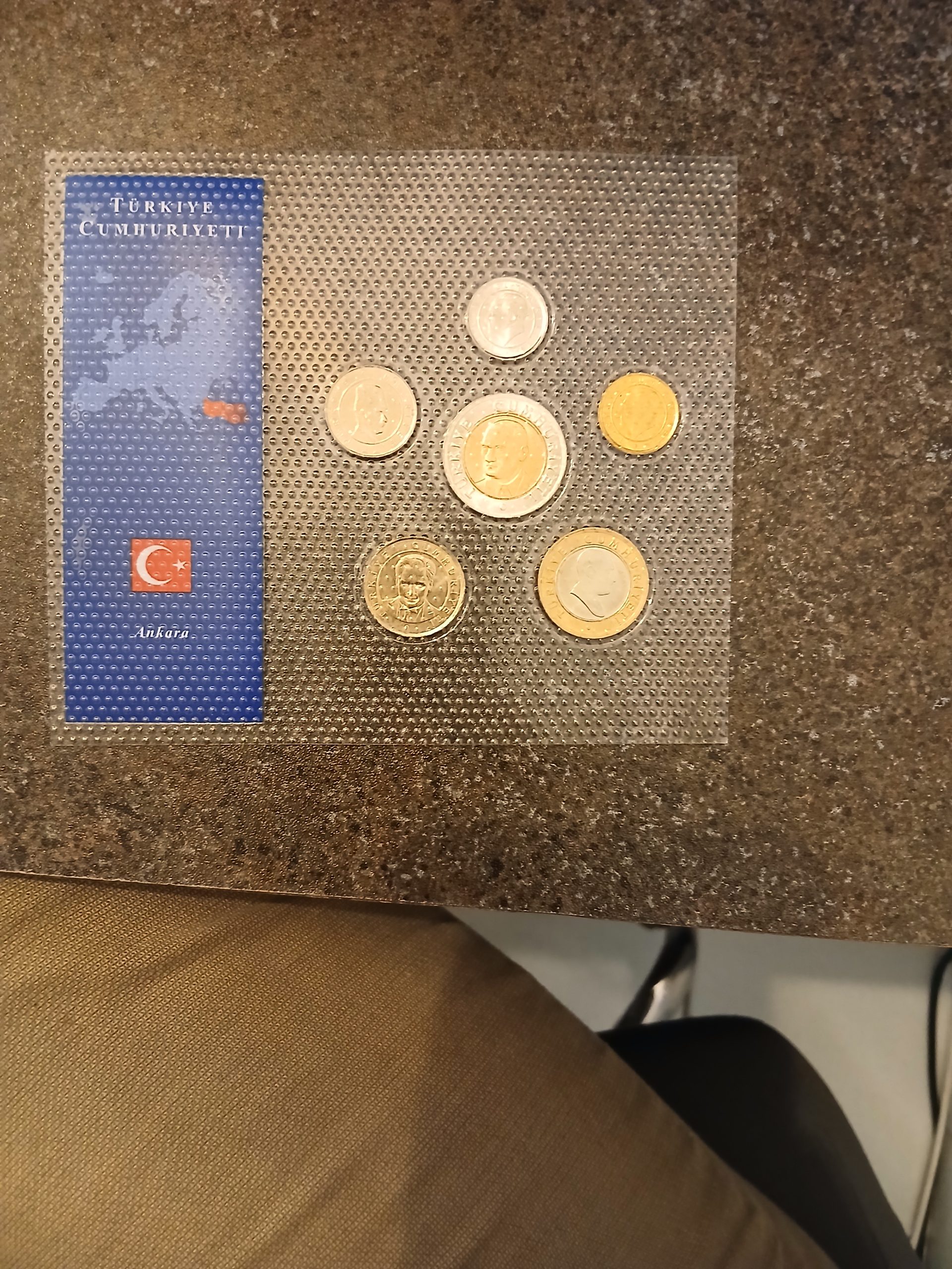 Série des pièces de monnaie turques composée des pièces de : 1, 5, 10, 25 et 50 kurus et 1 Livre de 2005. Pièces neuves placées sous blister.
