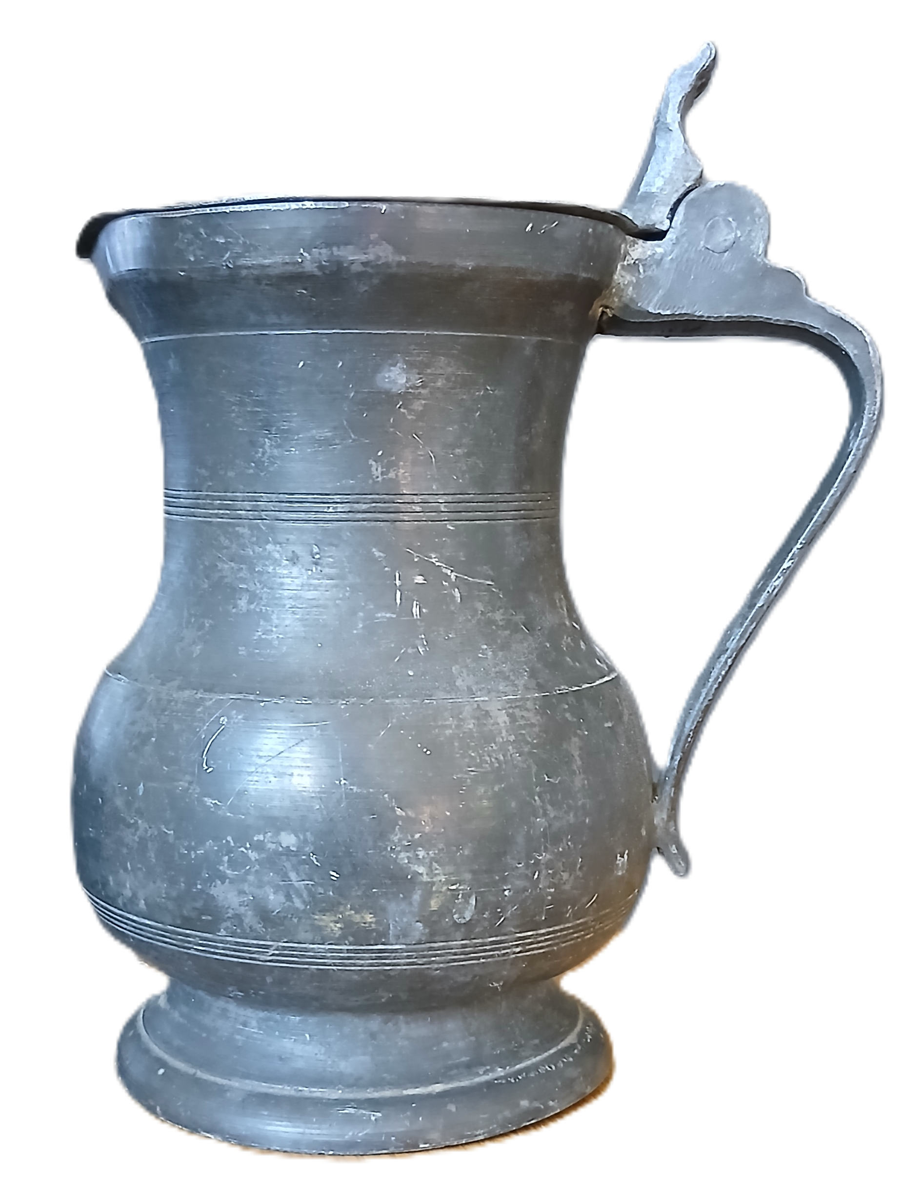 Pichet de taverne ancien en étain du 18ème siècle avec deux poinçons royaux en excellent état. Son ventre mesure 12,5cm de diamètre, sa largeur hors tout avec l’anse fait 14,5cm. Sa hauteur est de 20cm. Poids d’étain 1,2kg.