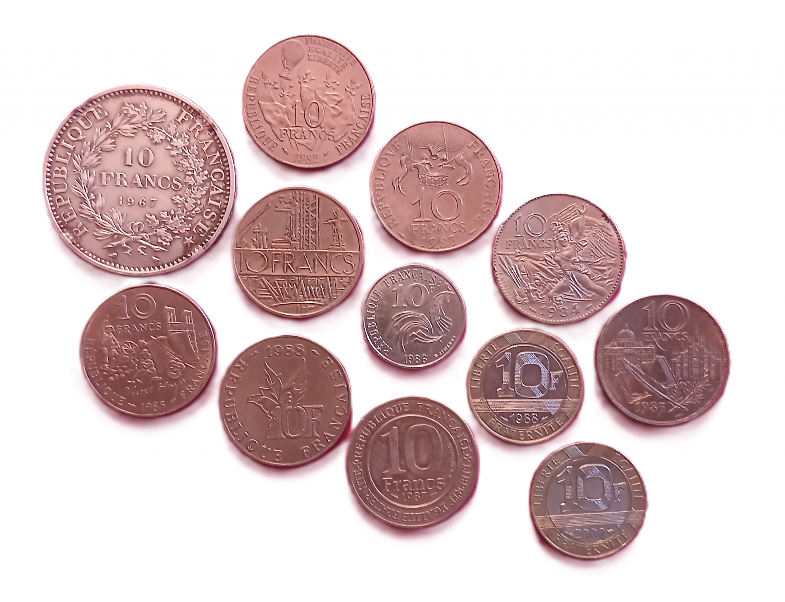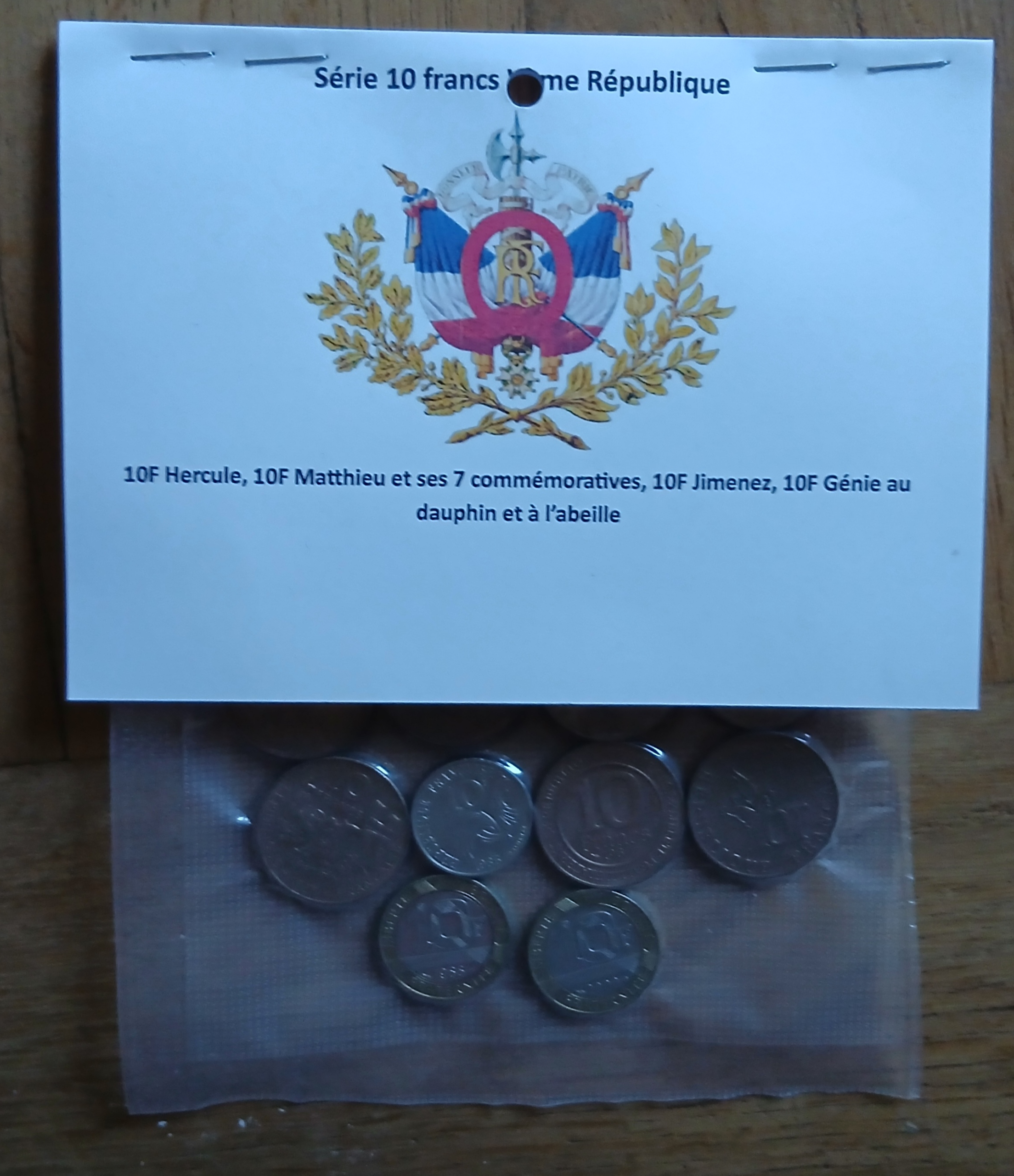 La collection comprend les pièces de : 10F Hercule en argent, 10 francs Matthieu, Gambetta, Conquête de l’Espace, Stendhal, François Rude, Victor Hugo, Capétiens, Roland Garros, 10F Jimenez, 10F Génie au dauphin, 10F Génie à l’abeille.