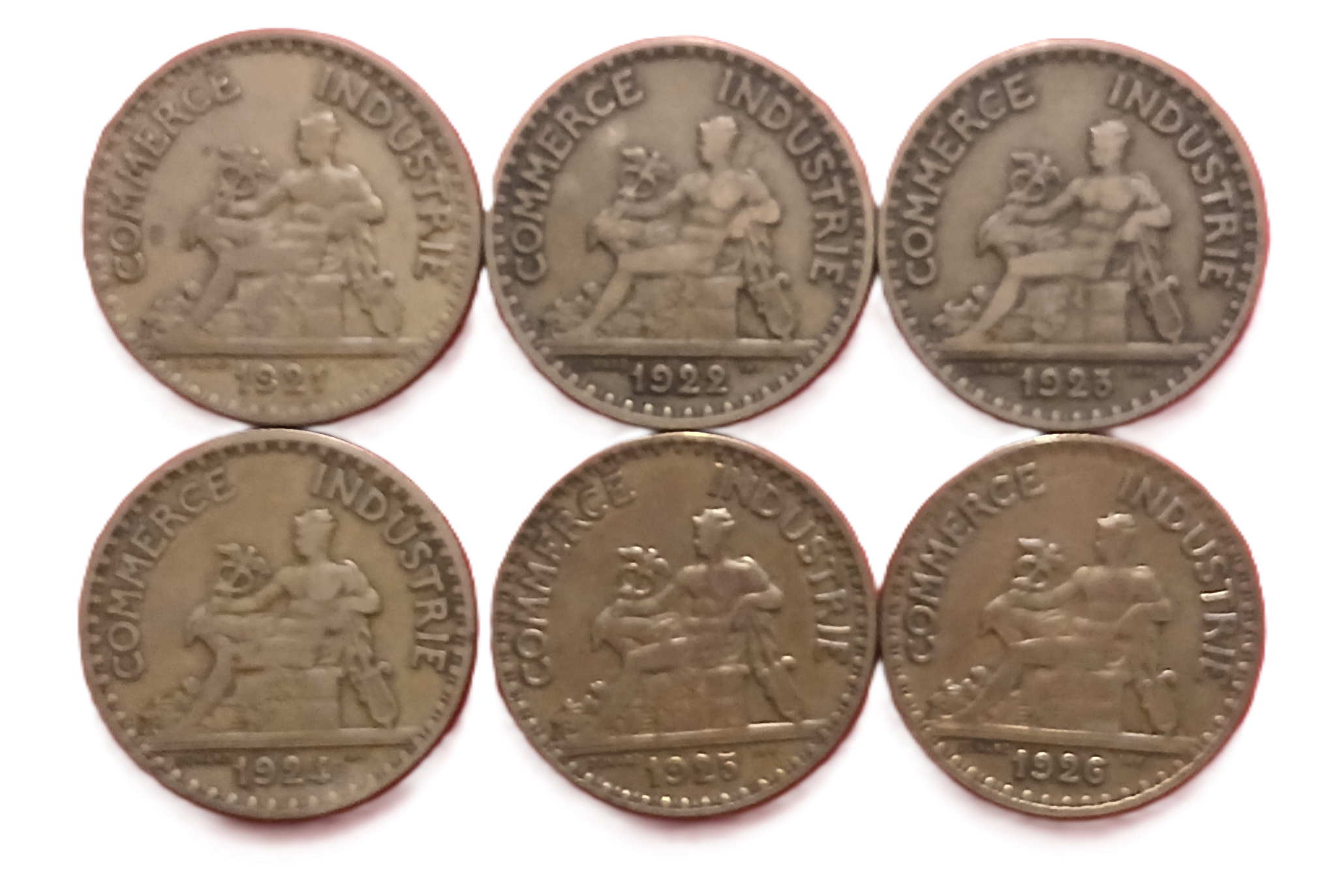 La collection comprend les pièces de 2 francs : 1921, 1922, 1923, 1924, 1925, 1926.