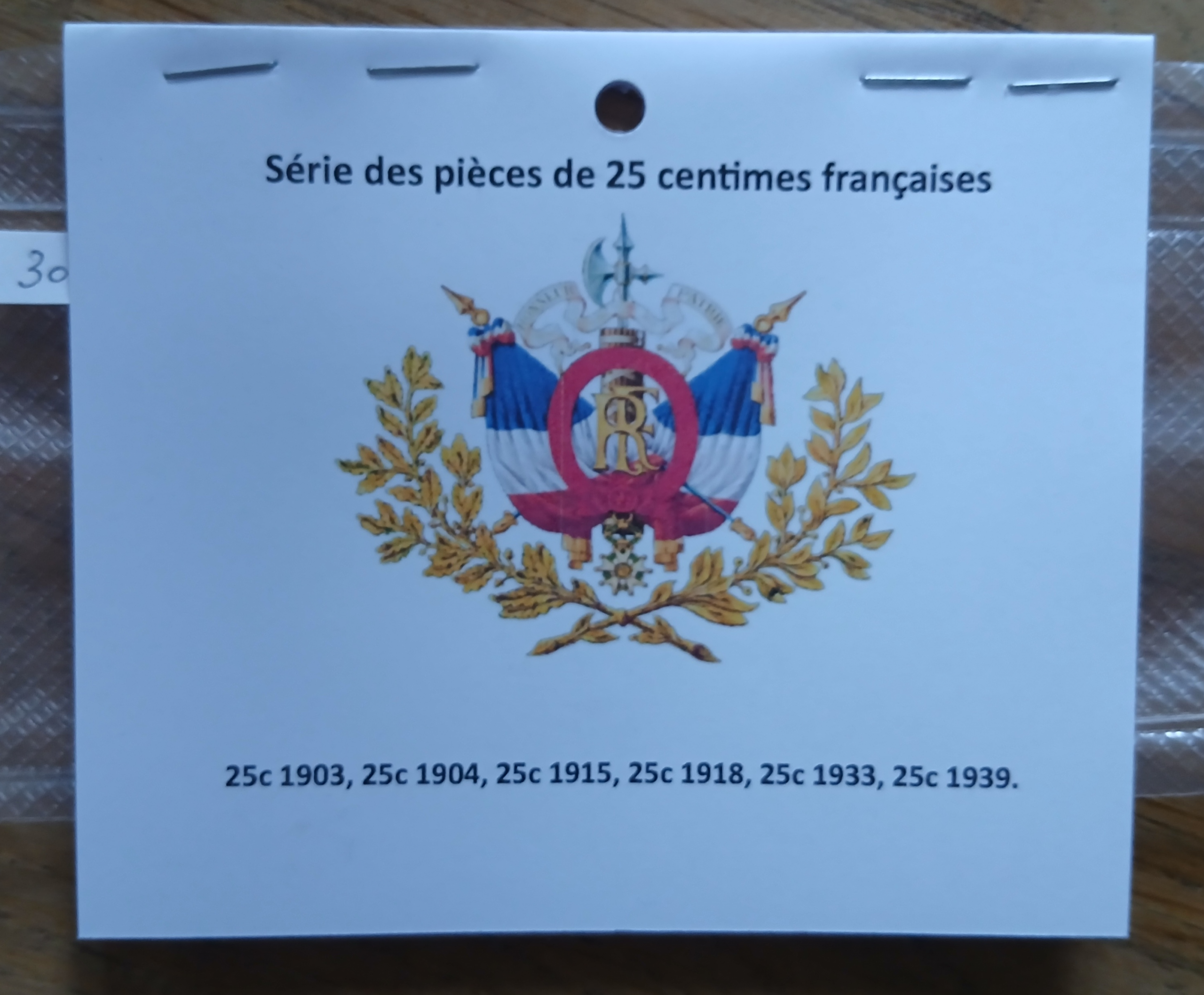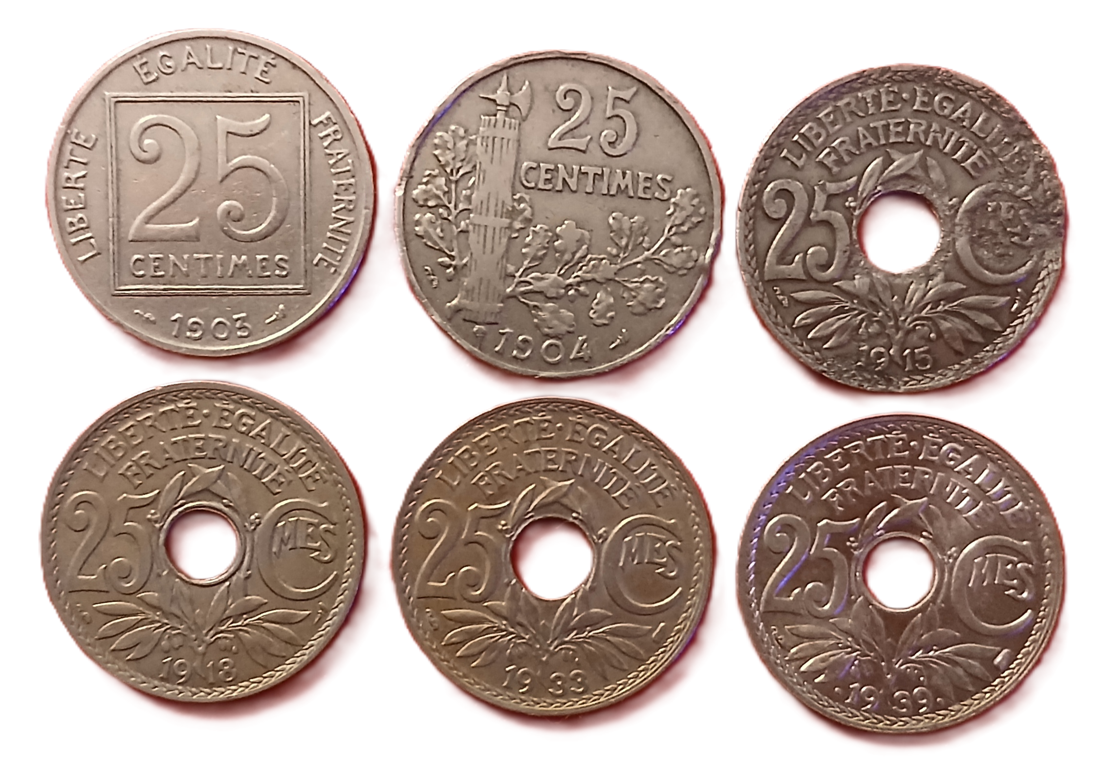 La collection comprend tous les formats de pièces de 25 centimes courantes françaises : 25c Patey au carré de 1903, 25c Patey au faisceau de 1904, 25c Lindauer Cmes souligné de 1915, 25c Lindauer à la torche de 1918, 25c Lindauer à l’aile de 1933 et la 25c aux points de 1939.