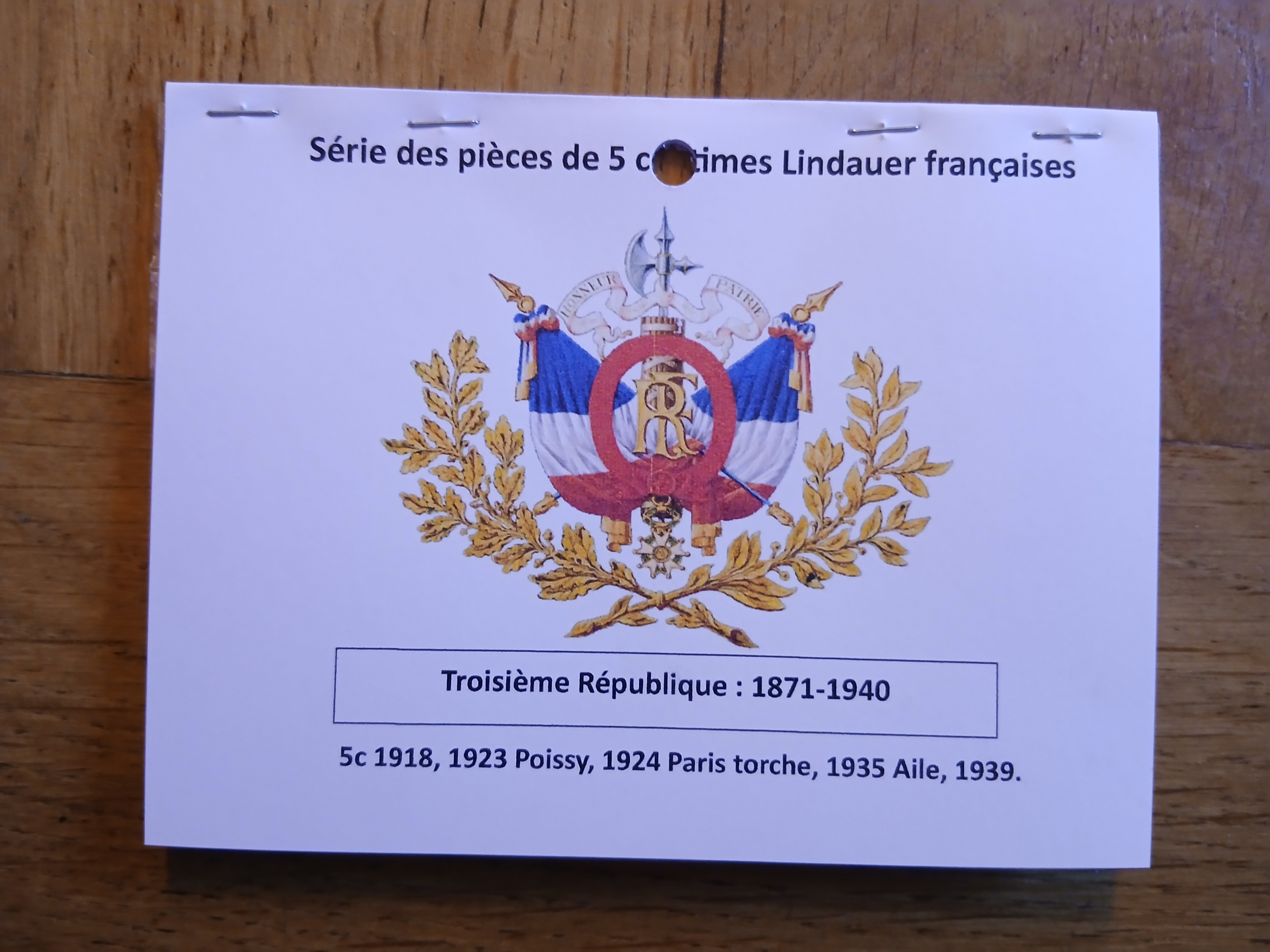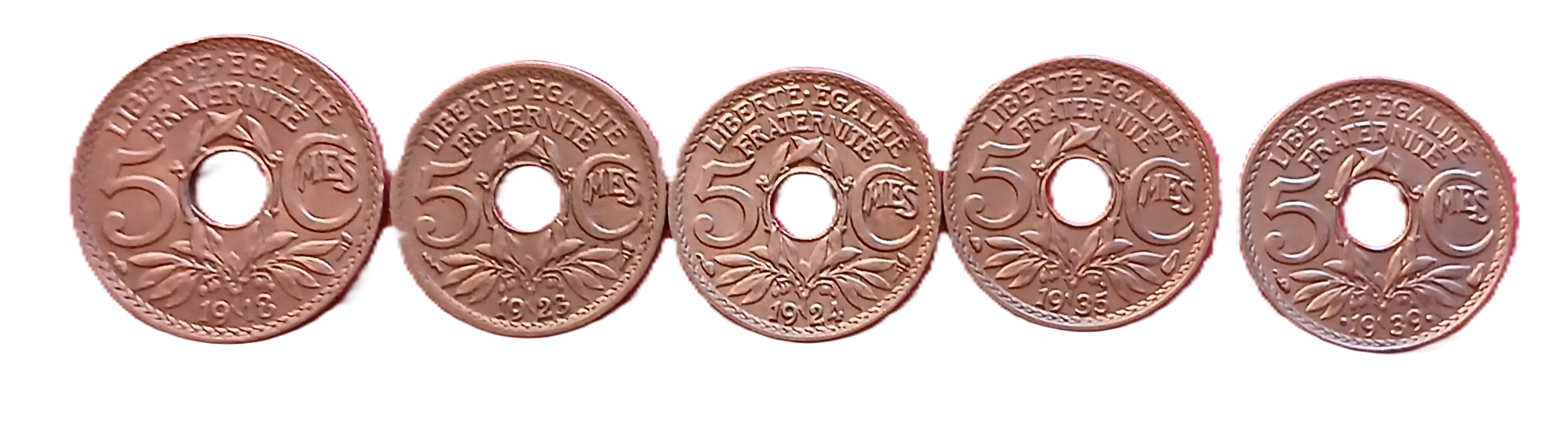 La collection comprend les pièces de 5 centimes type Lindauer : 1918, 1923 Poissy, 1924 Paris torche, 1935 Aile, 1939.