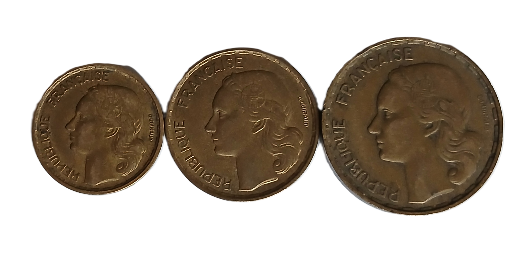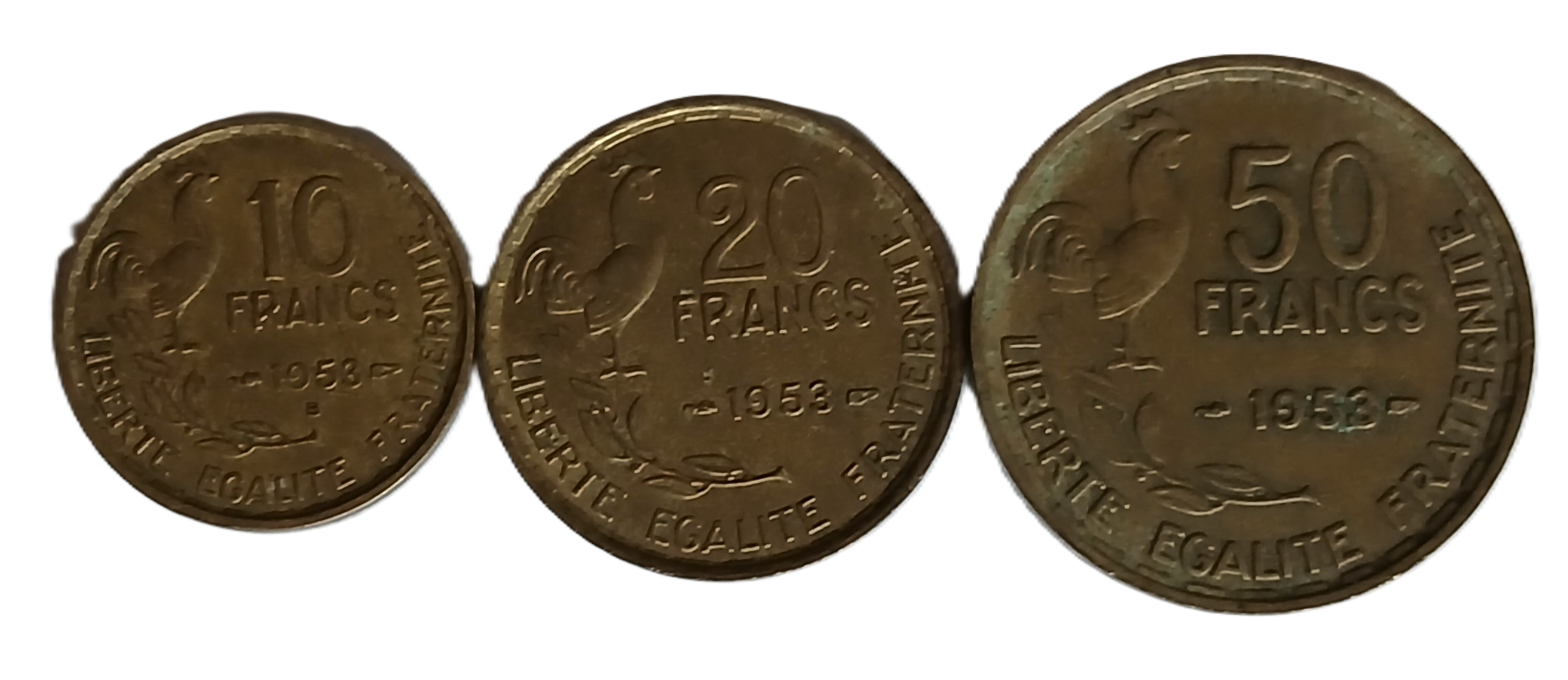 Série des pièces de monnaie françaises courantes frappées en 1953, composé de : 10 francs 1953 B, 20 francs 1953, 50 francs 1953.