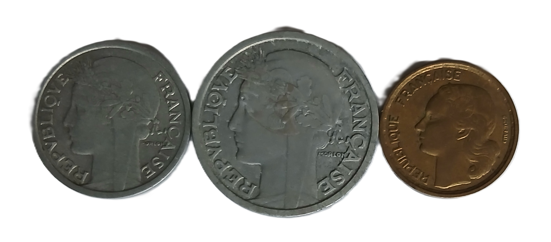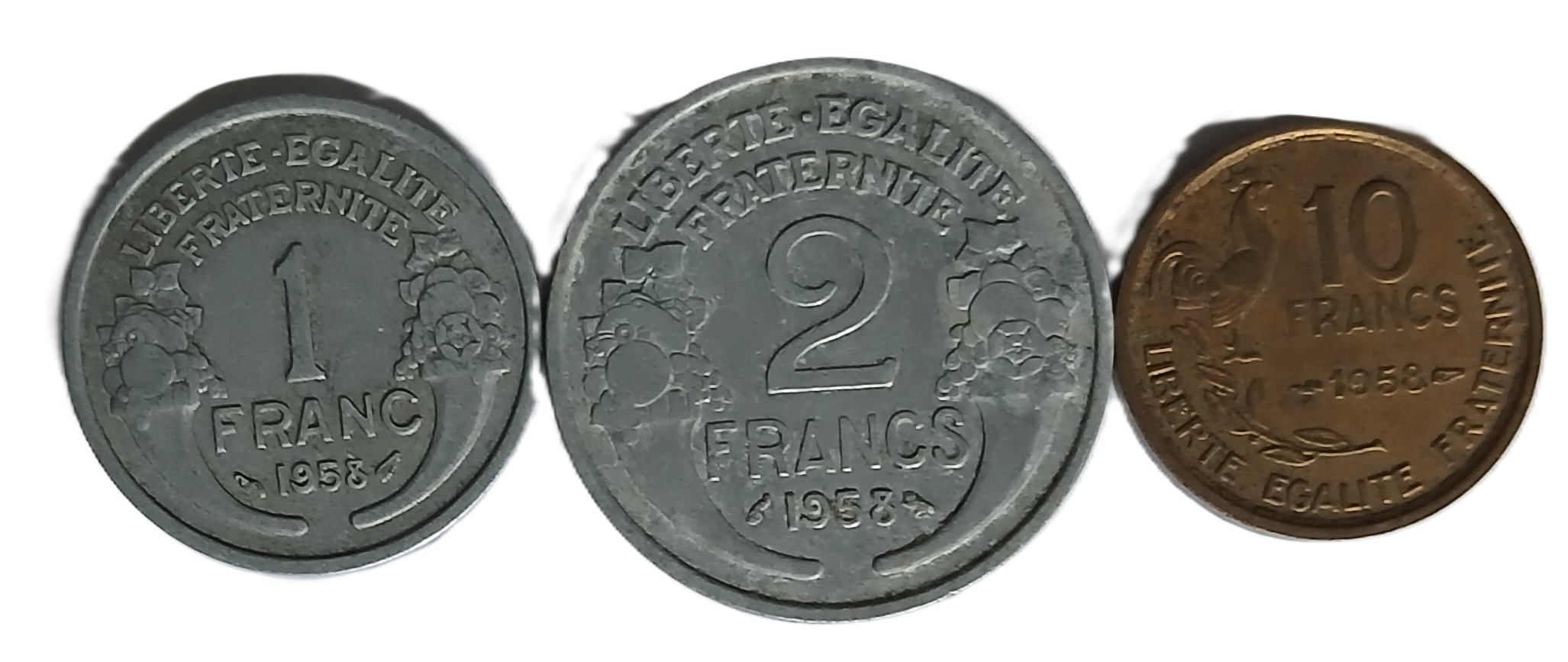 Série des pièces de monnaie françaises courantes frappées en 1958, composé de : 1 franc 1958, 2 francs 1958, 10 francs 1958.
