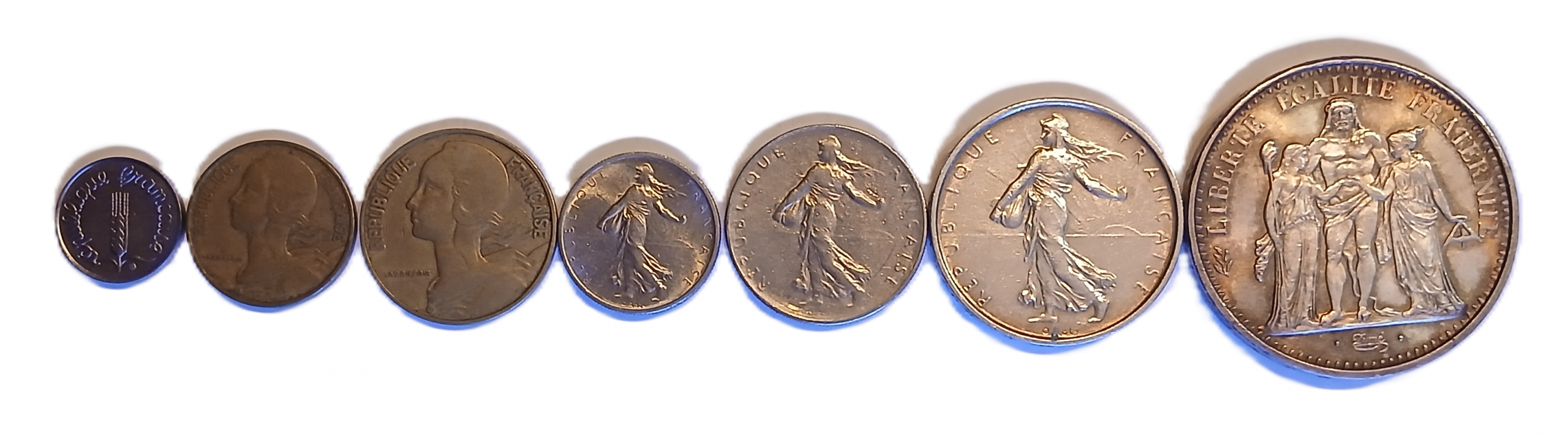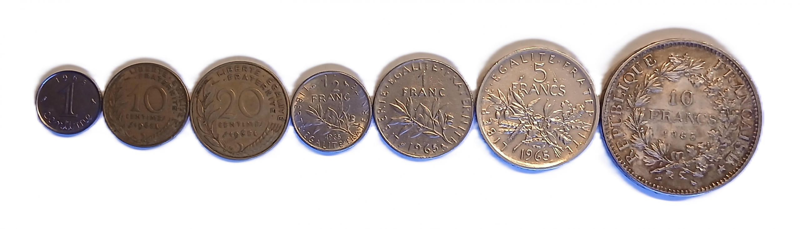 Série des pièces de monnaie françaises courantes frappées en 1965, composé de : 1 centime 1965, 10 centimes 1965, 20 centimes 1965, 1 franc 1965, 5 francs argent 1965, 10 francs argent 1965.