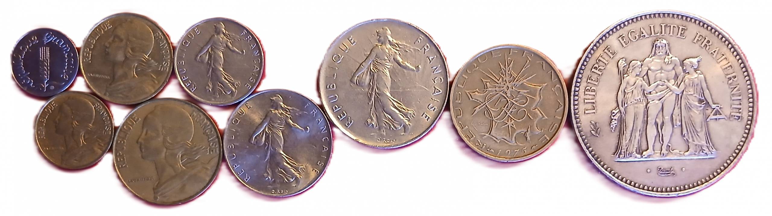 Série des pièces de monnaie françaises courantes frappées en 1975, composé de : 1 centime 1975, 5 centimes 1975, 10 centimes 1975, 20 centimes 1975, 1/2 franc 1975, 1 franc 1975, 5 francs 1975, 10 francs 1975 et 50 francs argent 1975.