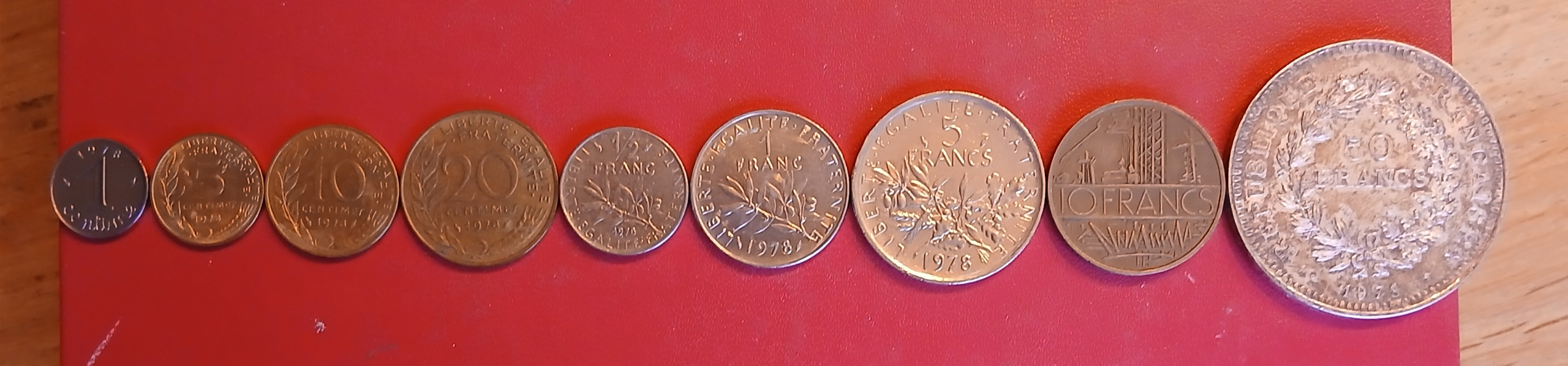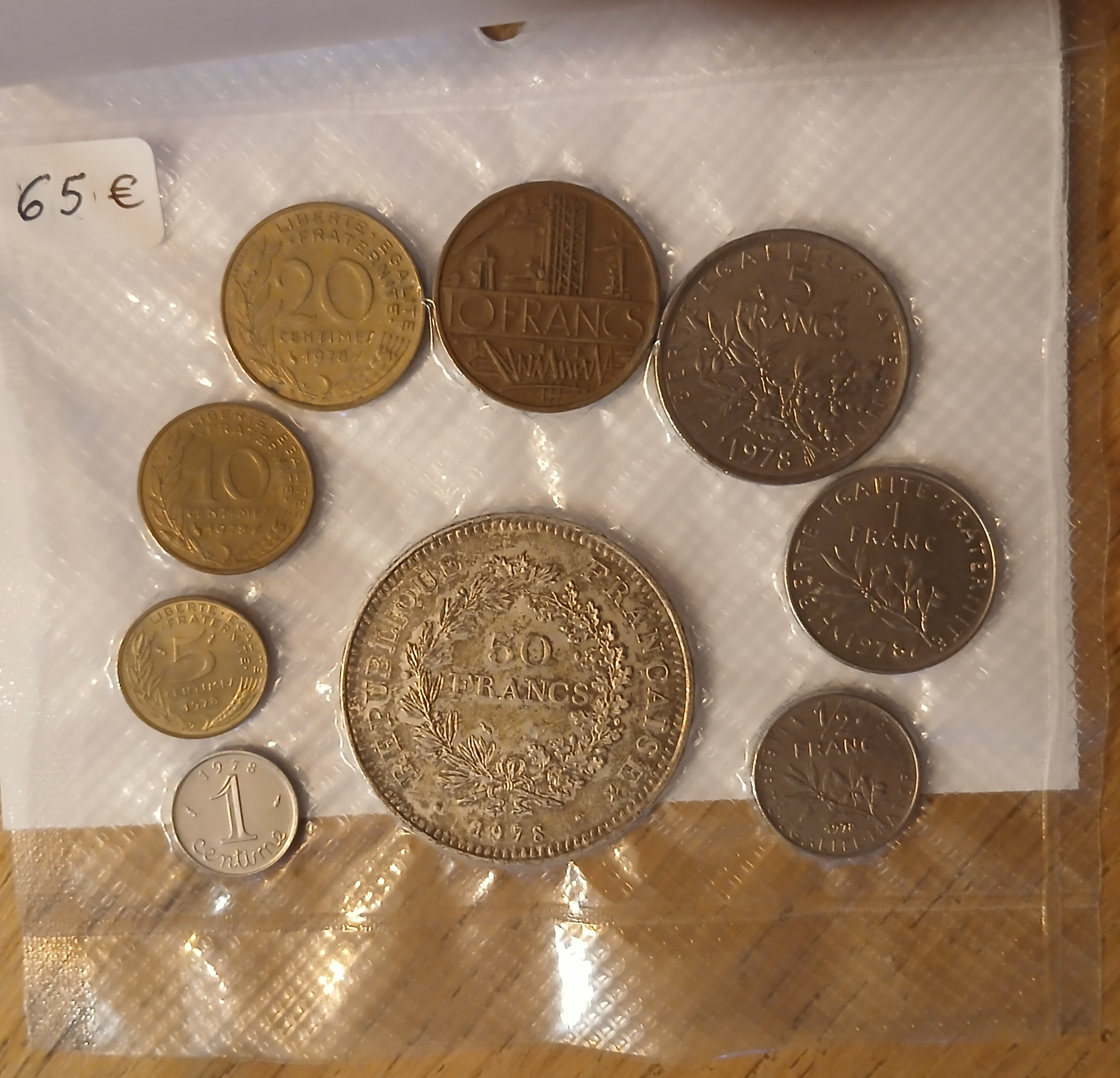 Série des pièces de monnaie françaises courantes frappées en 1978, composé de : 1 centime 1978, 5 centimes 1978 10 centimes 1978, 20 centimes 1978, 1/2 franc 1978, 1 franc 1978, 5 francs 1978, 10 francs 1978 et 50 francs argent 1978.