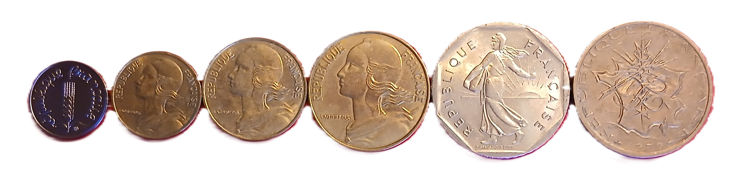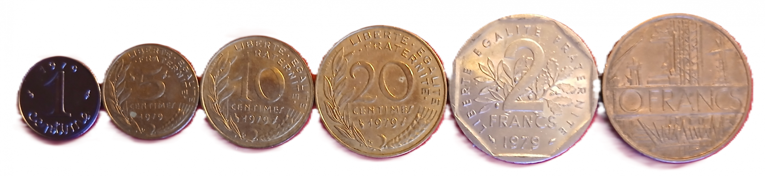 Série des pièces de monnaie françaises courantes frappées en 1979, composé de : 1 centime 1979, 5 centimes 1979, 10 centimes 1979, 20 centimes 1979, 2 francs 1979, 10 francs 1979.