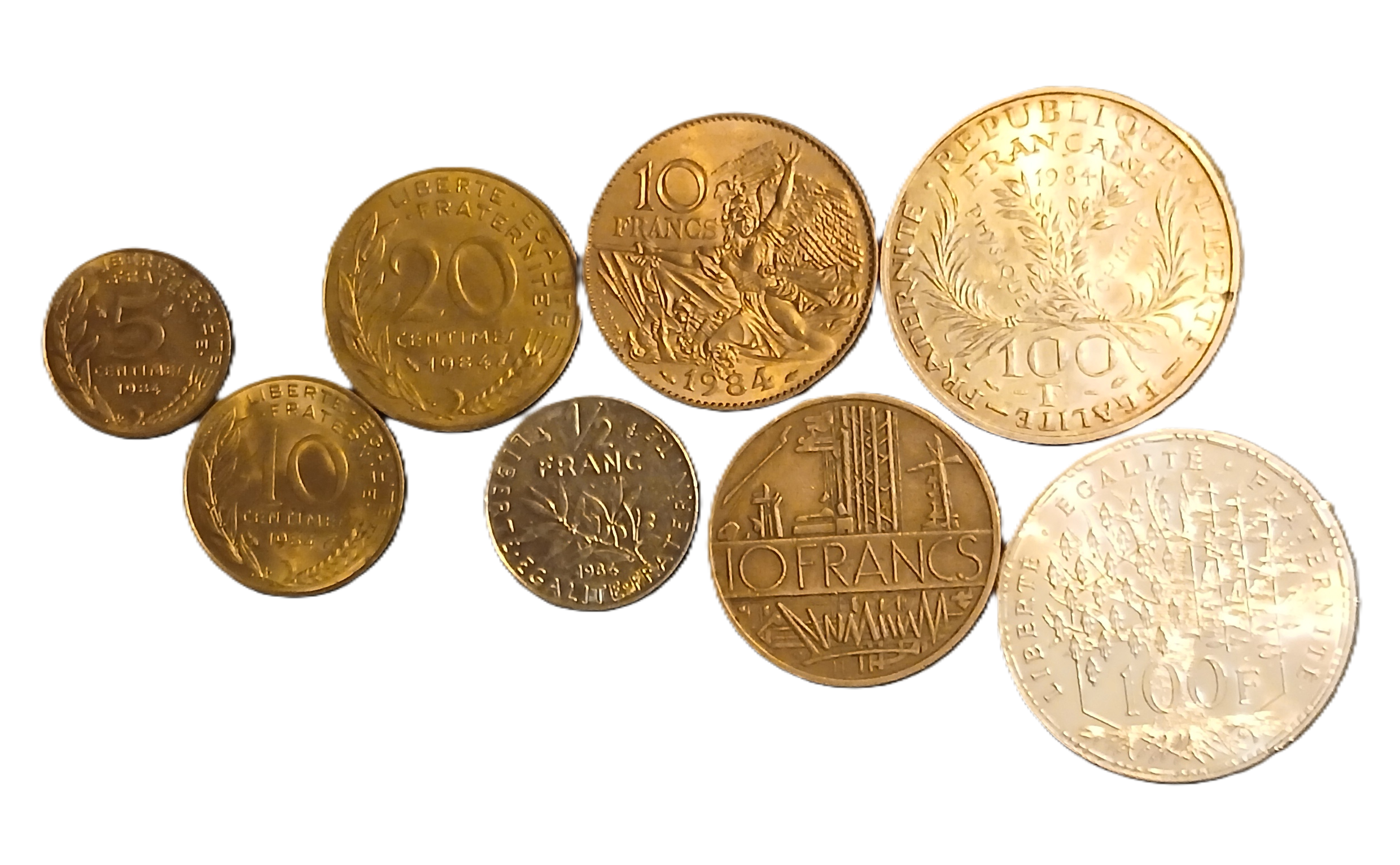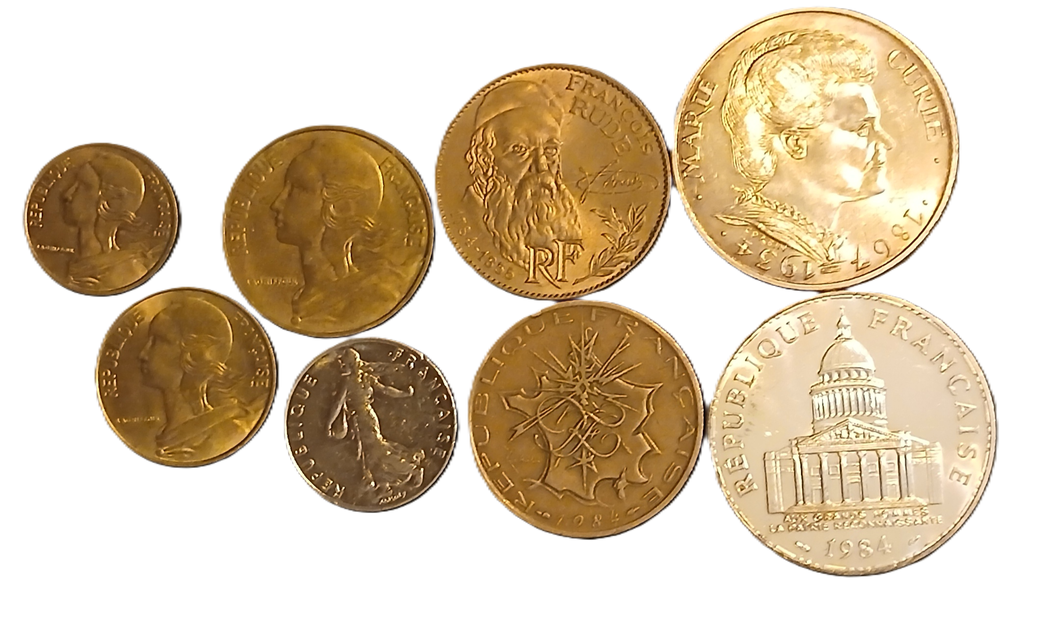 Série des pièces de monnaie françaises courantes frappées en 1984, composé de : 5 centimes 1984, 10 centimes 1984, 20 centimes 1984, 1/2 francs 1984, 10 francs Matthieu 1984, 10 francs Rude 1984, 100 francs Panthéon 1984 et 100 francs argent Curie 1984.