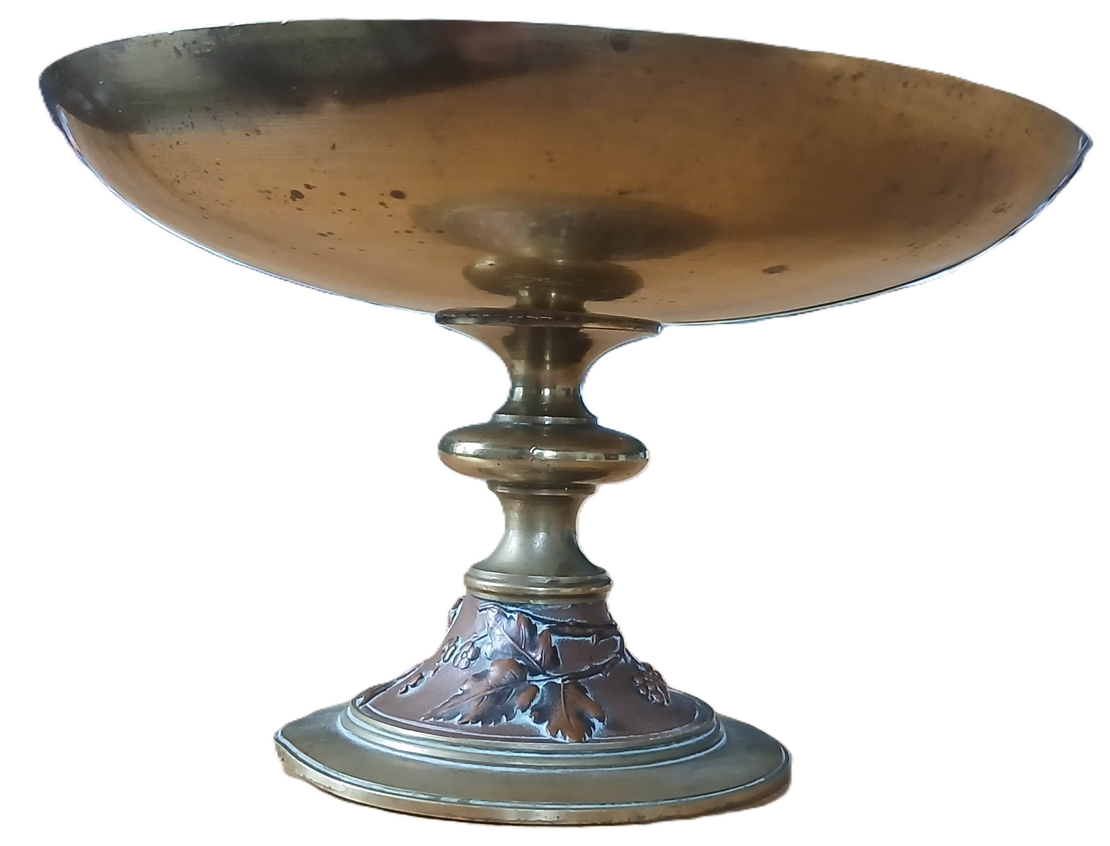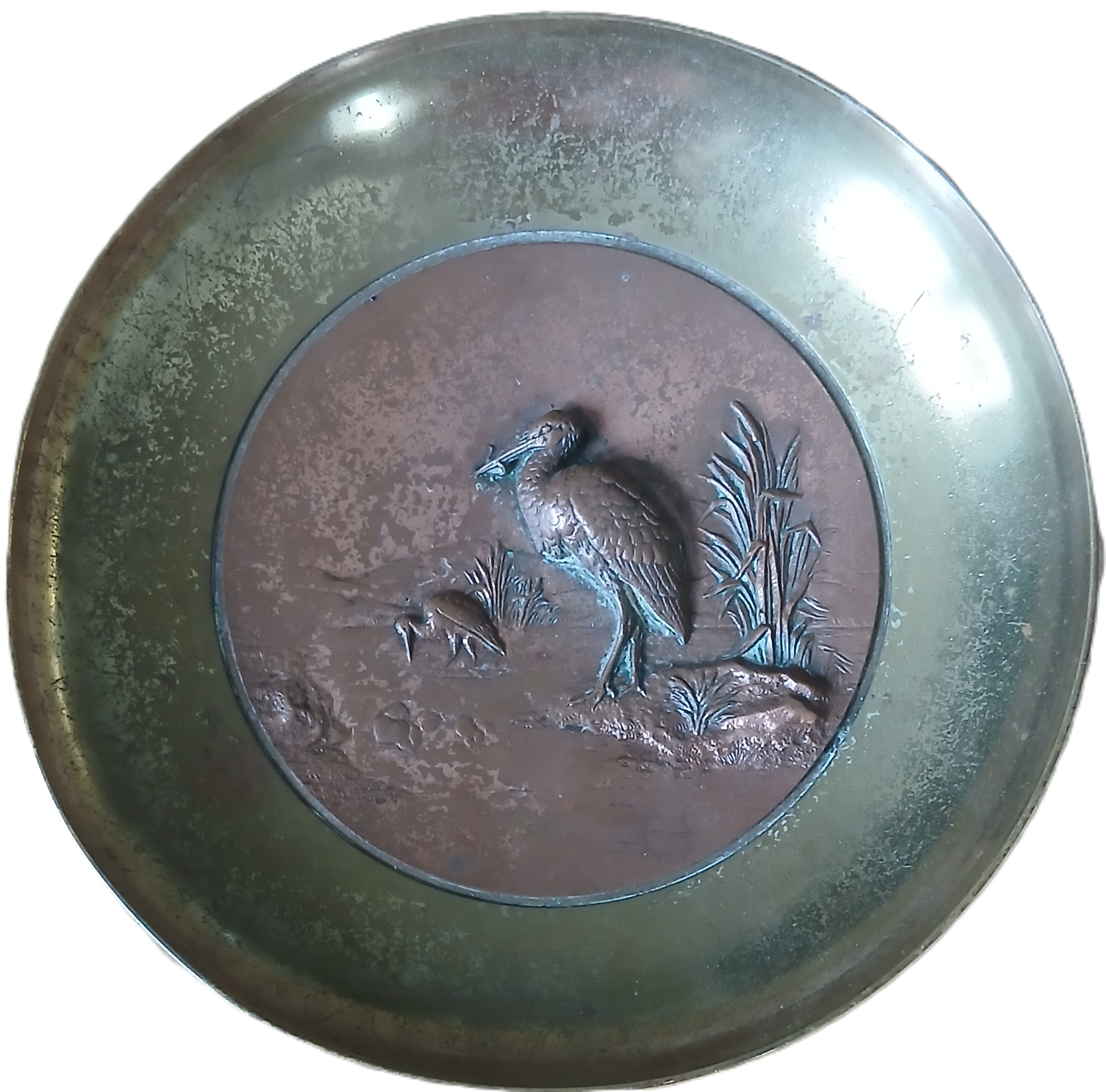 Très joli vide poche ancien en bronze doré et en cuivre. Motif nature sur le dessus avec sa cigogne en chasse et jolie vigne sculptée sur le pied. Diamètre 16cm, hauteur 10cm.